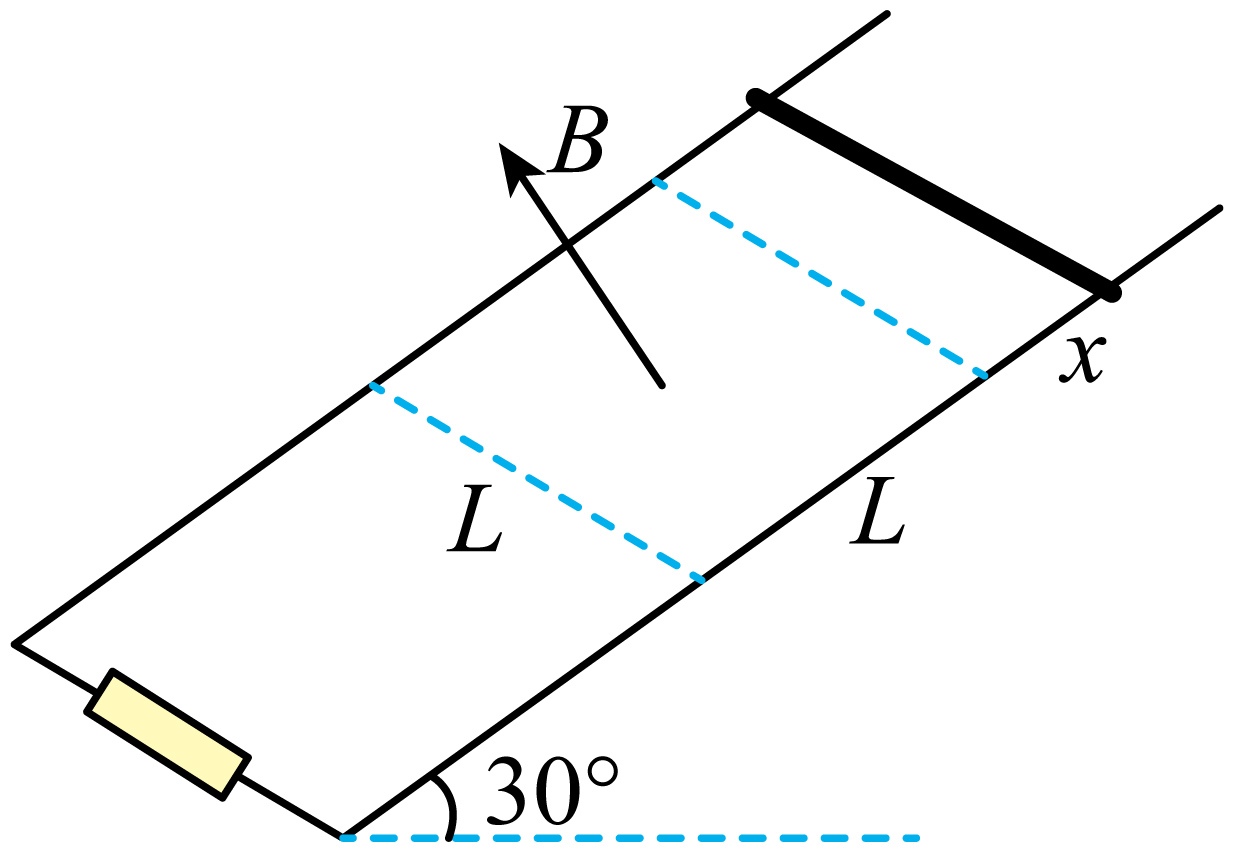 如图所示,与水平面成$30^\circ $角的光滑平行倾斜导轨,下端接阻值为$3\;\rm \Omega$的电阻。导轨中间虚线框部分为边长$1\;\rm m$的正方形。$t=0$时刻,质量为$0.2\;\rm kg$、阻值为$6\;\rm \Omega$的导体棒垂直导轨放置,从距离上端虚线$0.1\;\rm m$的位置由静止释放,同时虚线框内匀强磁场磁感应强度由$0$开始随时间均匀增加,方向垂直导轨平面向上。当导体棒刚进入磁场时,磁感应强度停止变化,且导体棒恰能匀速下滑。不计导轨电阻,重力加速度为$10\;\rm m/s^{2}$。求: