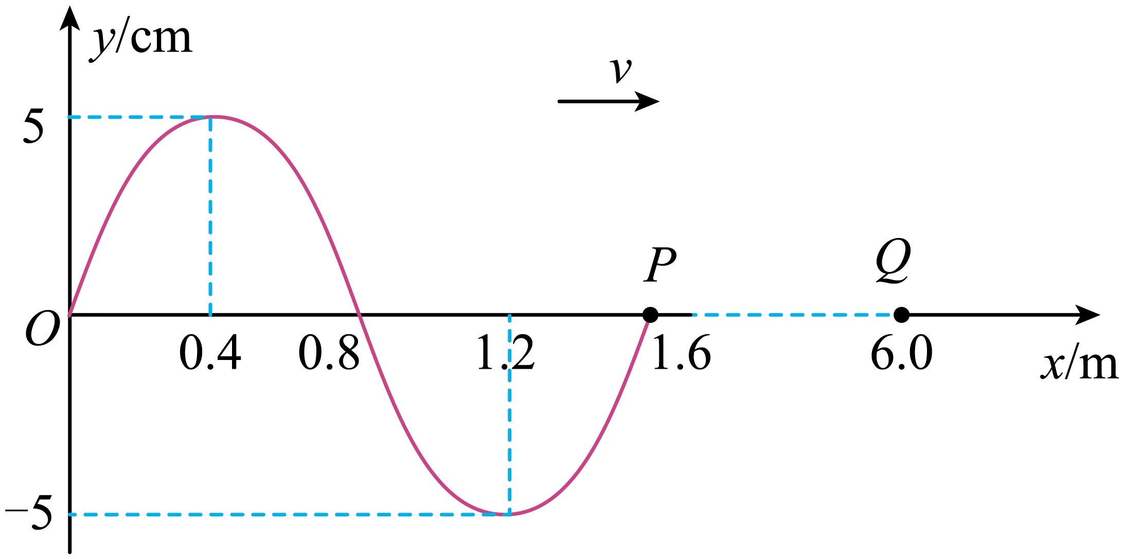 如图,为$t=0$时刻某简谐横波的波形图,此时波刚传至$x=1.6\;\rm m$的$P$点。已知波速大小$v=0.8\;\rm m/s$,质点$Q$的平衡位置坐标$x=6.0\;\rm m$。
