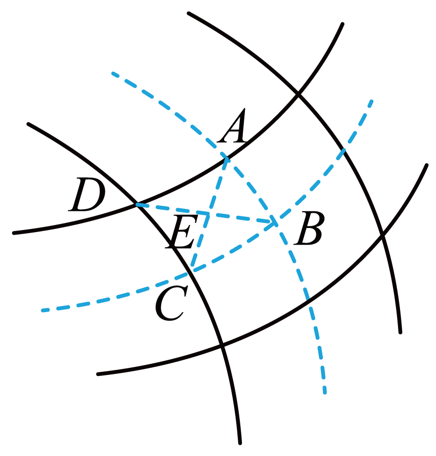 如图所示是水平面上两列频率相同的波在某时刻的叠加情况,图中实线为波峰,虚线为波谷。已知两列波的振幅均为$2\;\rm cm$,波速为$2\;\rm m/s$,波长为$8\;\rm cm$,$E$点是$B$、$D$和$A$、$C$连线的交点,下列说法中正确的是$(\quad\ \ \ \ )$。