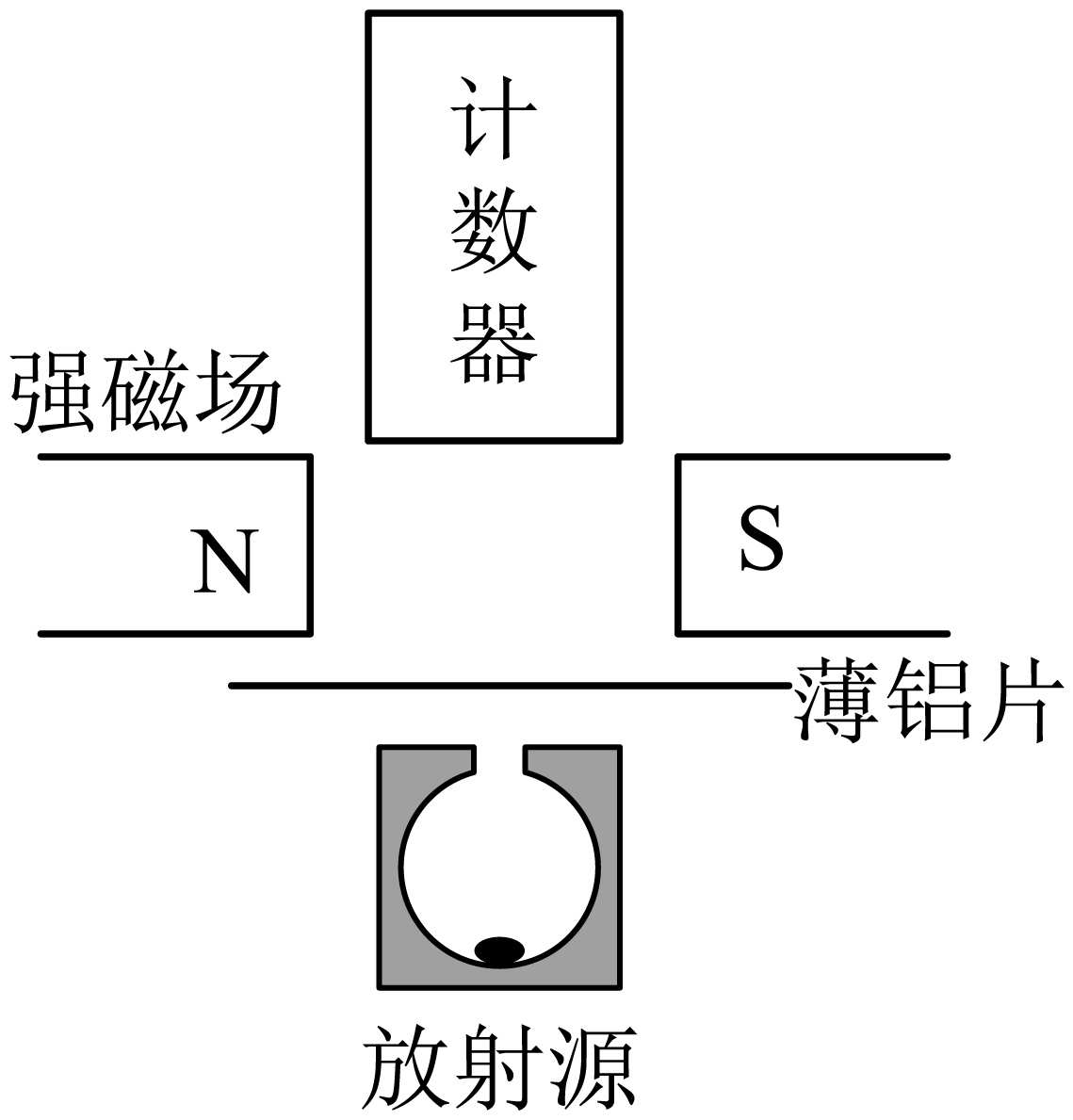 "]将磁铁移开后,计数器所得计数率保持不变,说明穿过铝片的粒子中无带电粒子,故包含有$\gamma$射线;将薄铝片移开,计数率大幅上升,说明射线中有穿透力很弱的粒子,因此未知射线中包含$\alpha$射线和$\gamma$射线。