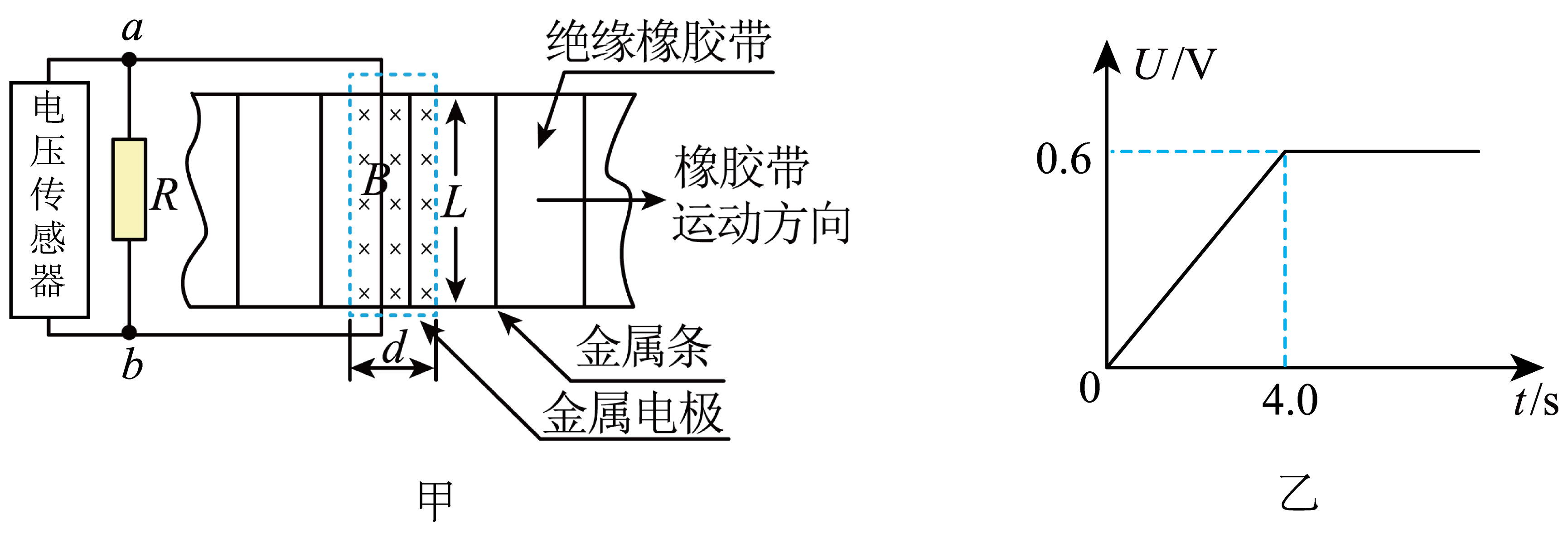 跑步机是一种健身器材,图甲为一种可测速跑步机的简单原理图。跑步机的底座固定一对间距$L=0.7\;\rm m$、宽度$d=0.3\;\rm m$的平行金属电极,其间充满磁感应强度$B=0.5\;\rm T$、方向垂直纸面向里的匀强磁场,左侧与电压传感器(看成理想电压表)和阻值为$0.5\;\rm \Omega$的电阻$R$连接,绝缘橡胶带上每隔距离$d$就嵌入一个电阻$r=0.2\;\rm \Omega$的平行金属条。跑步机工作时绝缘橡胶带跟随脚步一起运动,金属条与电极接触良好,且任意时刻仅有一根金属条处于磁场中。健身者在一次跑步过程中,电压传感器将其两端的电压$U$即时采集并输入电脑,获得的电压$U$随时间$t$变化的关系图像如图乙所示。