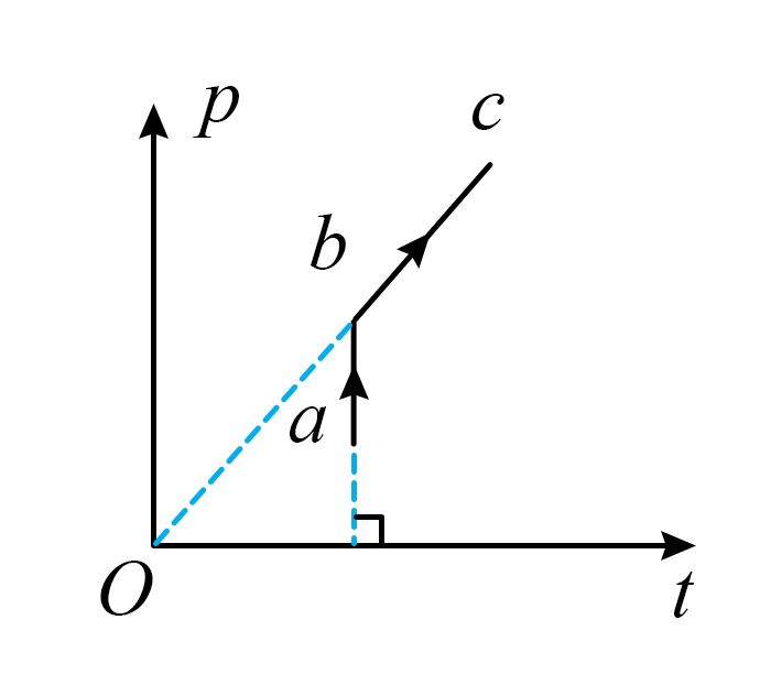 可知$p − t$图像斜率为$\dfrac{C}{V}$,若为等容变化,则图像为过横轴点$t=-273.15^\circ C$的一条直线,连接图像上的点到该横轴点的连线斜率表示$\dfrac{C}{V}$,结合图像可知从$a→b→c$图像上的点到该横轴点的斜率$\dfrac{C}{V}$均增大,故体积一直减小。