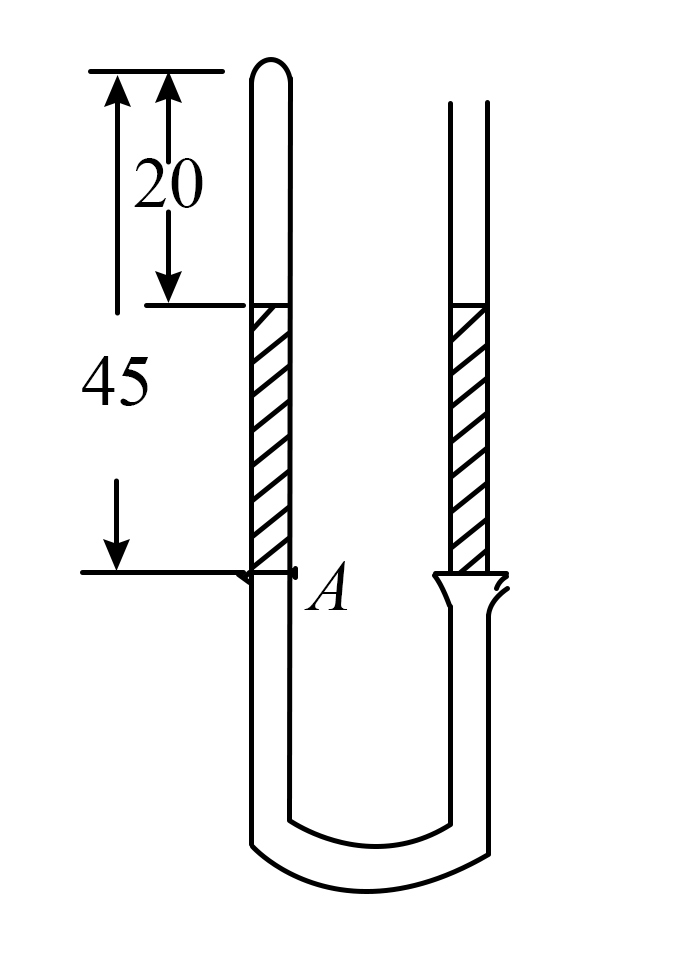 两根直径相同的、粗细均匀的玻璃管,用橡皮管相连接,中间灌有水银,左边玻璃管长$45\;\rm cm$,上端封闭$20\;\rm cm$长的空气柱。右管上端开口,如图。大气压强为$75\;\rm cmHg$,起初两边液面等高,现在固定左管,慢慢改变右管的高度,使左管的空气柱长变为$30\;\rm cm$。此时左管中气体的压强为 $\;\rm cmHg$;右管应在竖直方向向 移动,如果这时$A$处的橡皮管和左边的玻璃管脱开,左面玻璃管中的水银 向外泄漏。(填“会”或“不会”)?