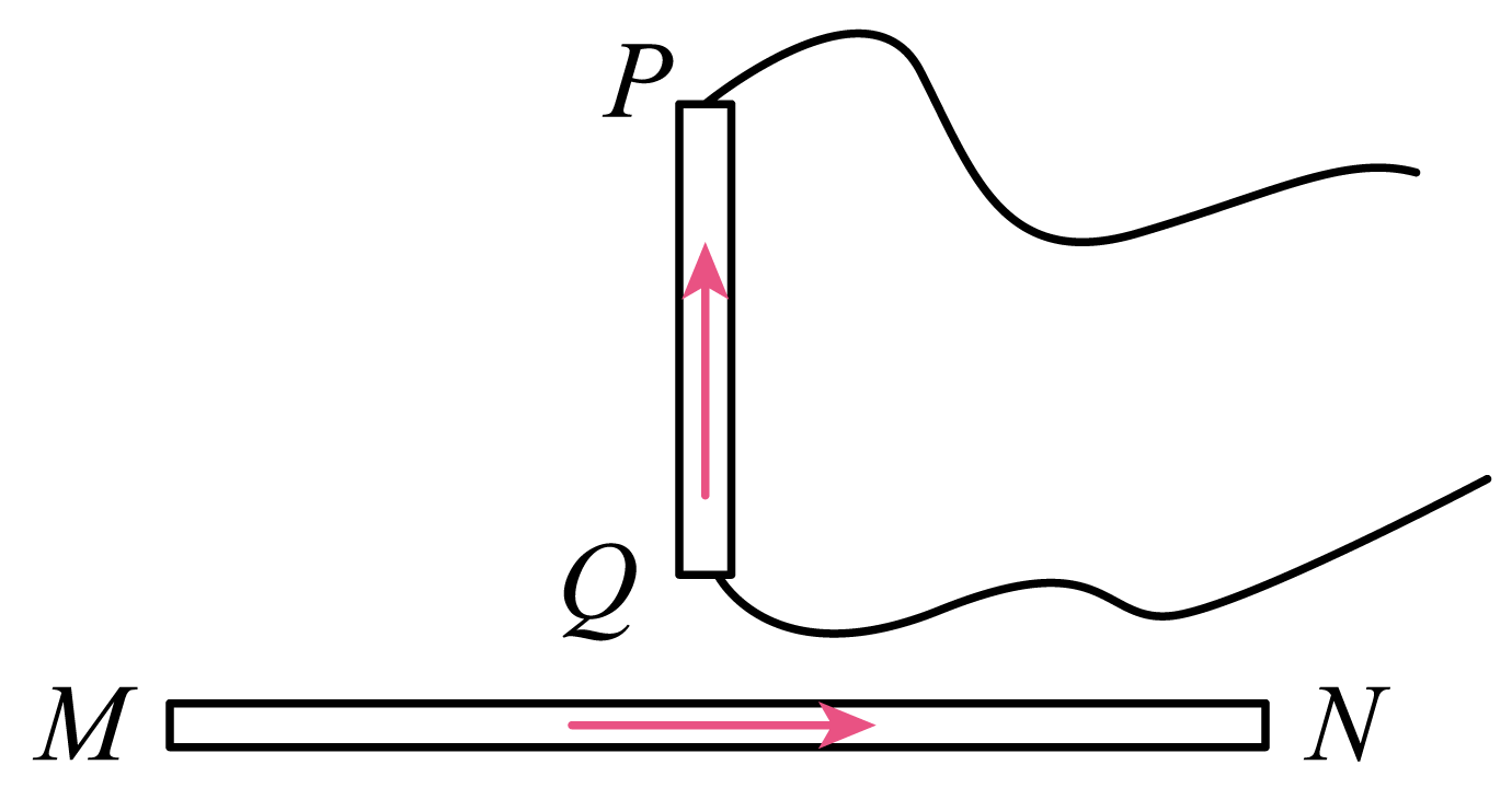 根据右手螺旋定则分析可知,导体棒$MN$在上方产生的磁场方向垂直于纸面向外。导体棒$PQ$电流方向向上,根据左手定则可知,导体棒$PQ$所受安培力方向向右。根据通电直导线在周围产生的磁场分布可知,离导体棒$MN$越近,磁场越强,离导体棒$MN$越远,磁场越弱。所以导体棒$PQ$下半部分受力大于上半部分受力。