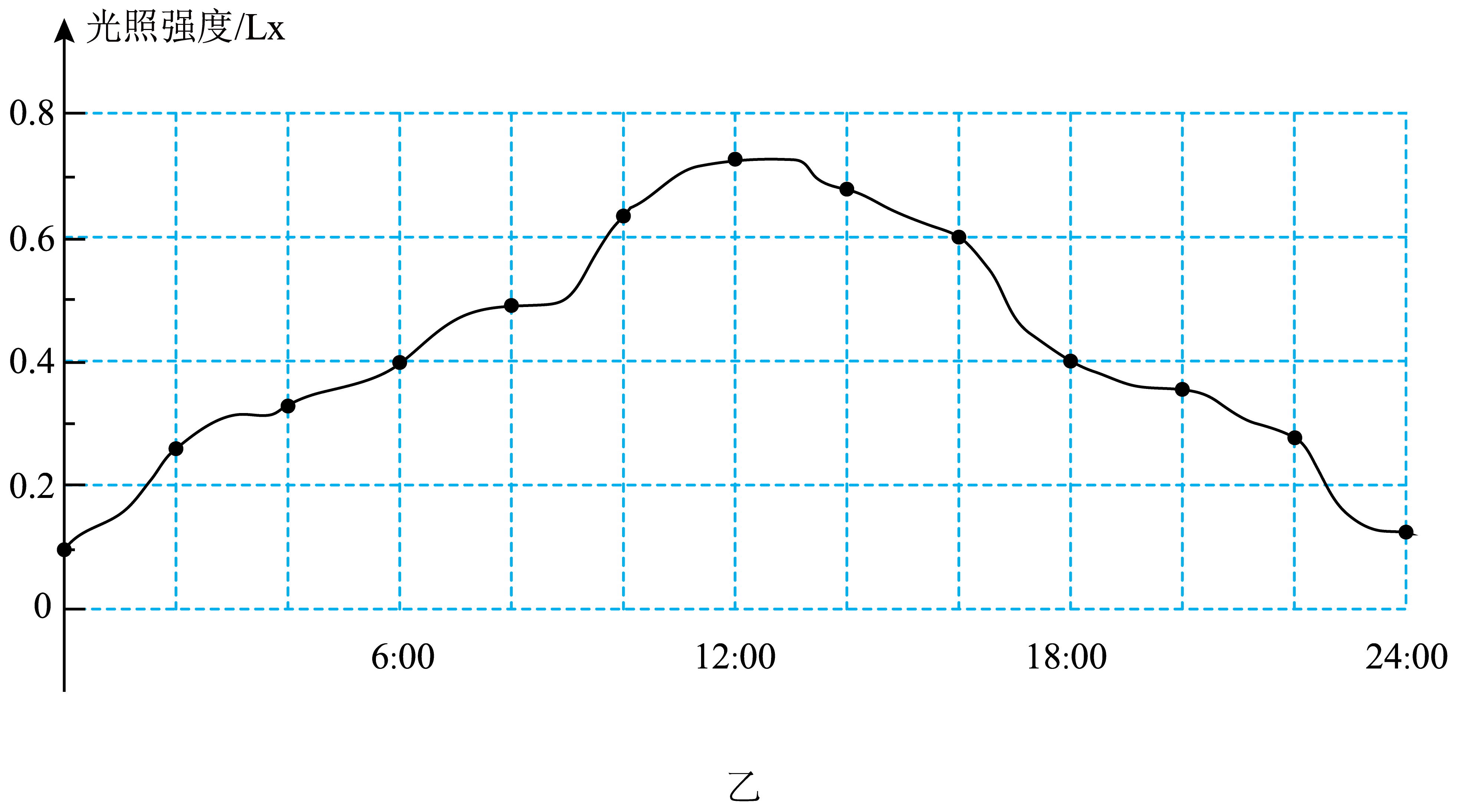 $\rm C$.若将定值电阻的阻值变为$20\;\rm k\Omega$,则控制开关自动启动时光敏电阻为$40\;\rm k\Omega$,此时对应照度为$0.4\;\rm Lx$,根据图乙可知该天系统工作时间段为$0 ∼ 6 : 00$、$18 : 00 ∼ 24 : 00$,故$\rm C$错误;