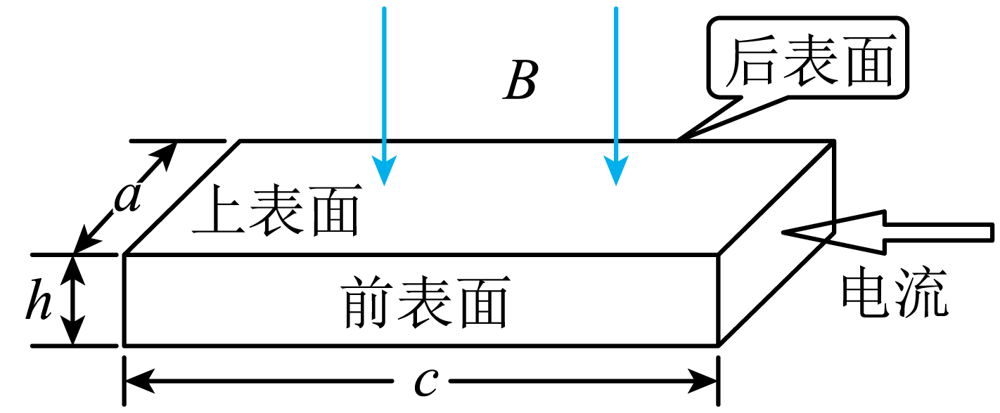 一块宽为$a$、长为$c$、厚为$h$的霍尔元件,元件内的导电粒子是电荷量为$-e$的自由电子。电流方向如图,电子的定向移动速度为$v$。若元件处于垂直于上表面、方向向下的匀强磁场中,磁场的磁感应强度为$B$,此时前表面的电势 (填“高于”、“低于”或“等于”)后表面的电势。元件的前、后表面间电压$U=$ 。
