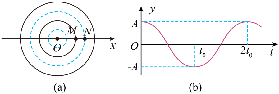 蜻蜓连续“点水”于平静水面的$O$处,形成的水波近似看作简谐横波。某时刻$(t=0)$水波图样如图($\rm a$)所示,图中实线、虚线分别表示波峰、波谷。$M$和$N$是相邻波峰和波谷上的两个质点,两质点振动的平衡位置均在$x$轴上。质点$M$的振动图像如图($\rm b$)所示。