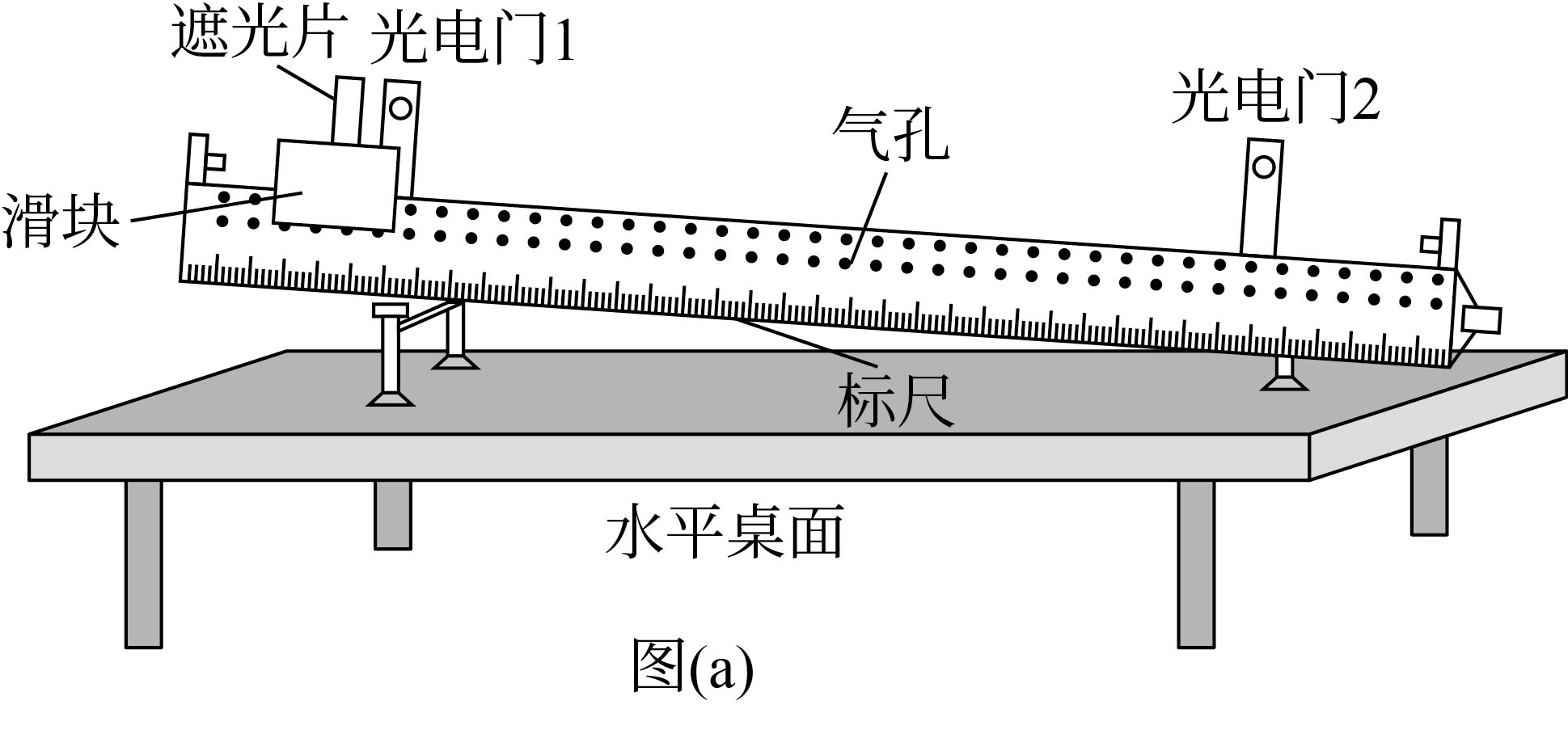 某小组利用气垫导轨、两个光电门、滑块、遮光片等,组成具有一定倾角的导轨装置,研究机械能守恒定律。重力加速度$g$取$9.80\;\rm m/s^{2}$。