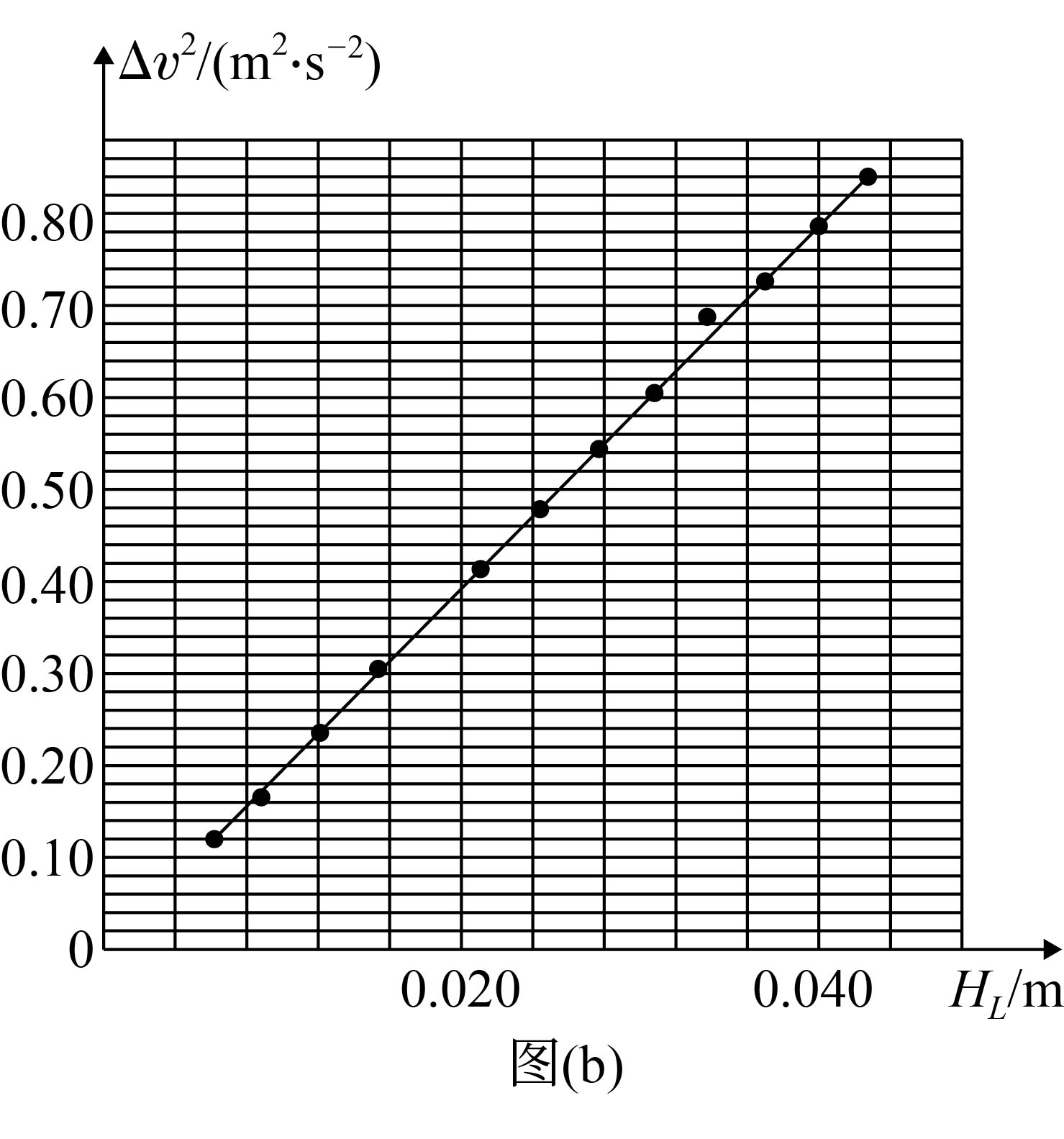 处理上表数据,并绘制$\Delta v^{2} − H_{L}$关系曲线(其中$\Delta v^{2}=v_{2}^{2} − v_{1}^{2}$),如图($\rm b$)所示。根据图$(\rm b)$中的信息,分析滑块在下滑过程中机械能是否守恒: ,并给出理由: 。