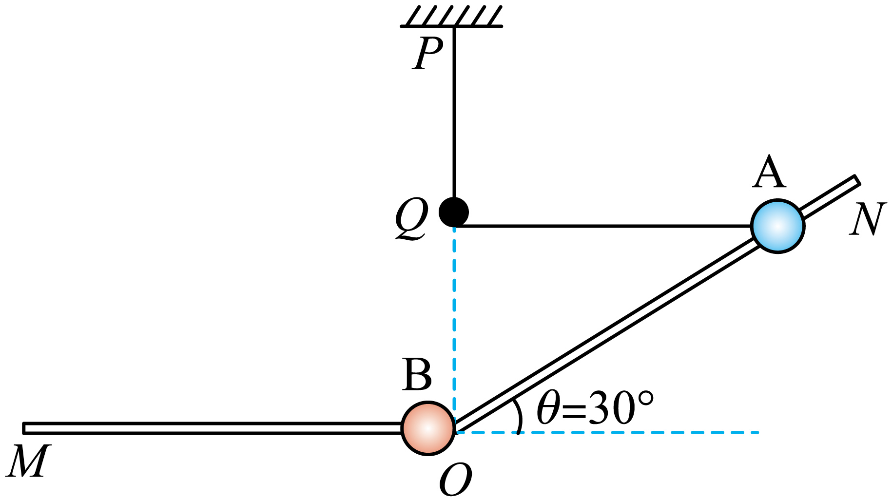 如图所示,在竖直平面内一轻质弹力绳的一端固定于$P$点,另一端经光滑孔钉$Q$连接质量为$m$的小球$A$,该球穿过与水平直杆$OM$(足够长)成$30^\circ $角的直杆$ON$,两杆平滑连接。点$P$、$Q$和$O$在同一竖直线上,$PQ$间距为弹力绳原长。将小球$A$拉至与$Q$等高的位置由静止释放。当小球$A$首次运动到斜杆底端$O$点后,在水平方向与穿在直杆$OM$且静止于$O$点、质量为$3m$的小球$B$发生弹性碰撞。小球$A$、$B$与杆间的动摩擦因数均为$\mu=\dfrac{\sqrt{3}}{3}$,且最大静摩擦力等于滑动摩擦力。弹力绳始终在弹性限度内且满足胡克定律,劲度系数为$k$,其弹性势能$E_{P}$与伸长量$x$的关系为$E_{\text{p}}=\dfrac{1}{2}kx^{2}$。已知重力加速度为$g$,$OQ$间距为$\dfrac{2mg}{k}$。