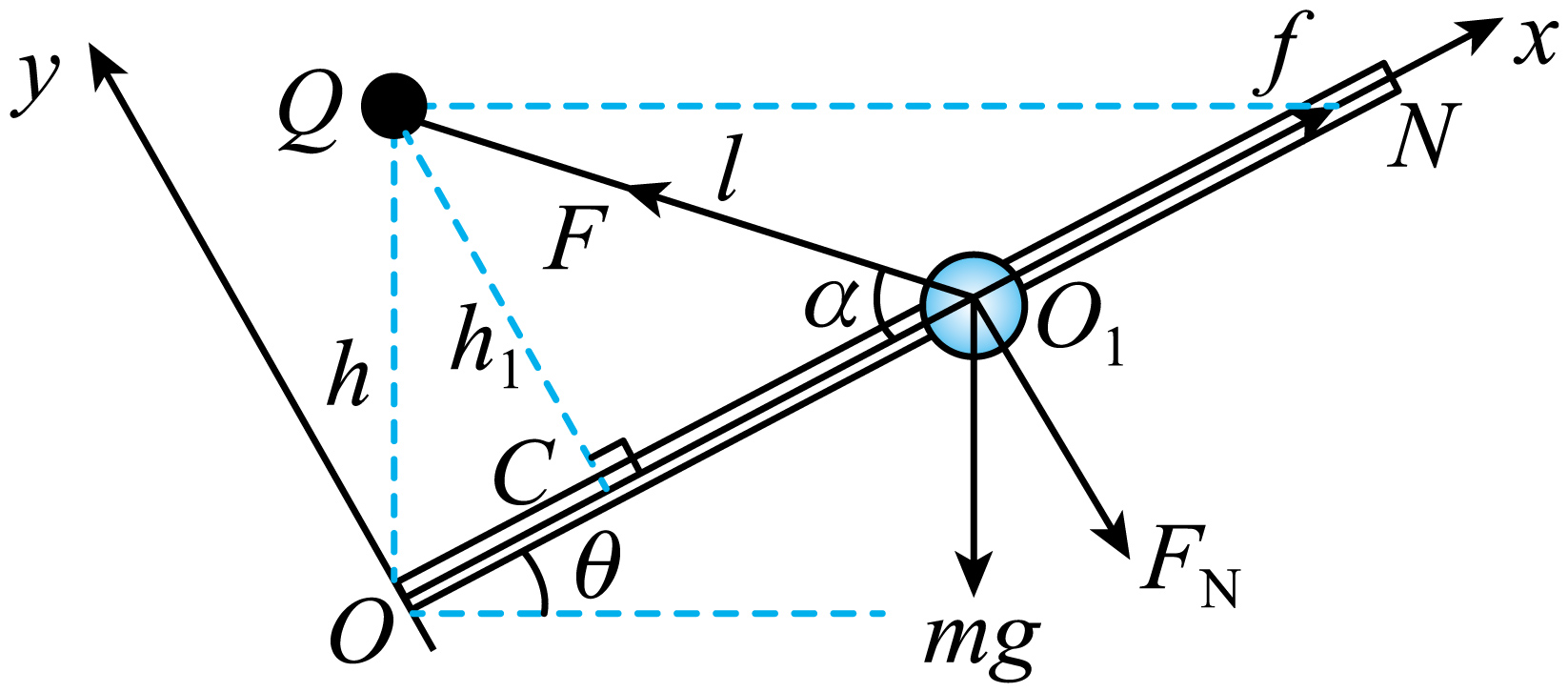 以$O$点为坐标原点,沿倾斜直杆$ON$向上为$x$轴正方向建立坐标系。任意选取小球$A$下滑过程中的某一位置$O_{1}$,设此时弹力绳的伸长量为$l$,小球$A$受到的滑动摩擦力为$f$,小球$A$对倾斜直杆的压力为$F_{N}$,小球$A$所受弹力绳的拉力为$F$,弹力绳与倾斜直杆的夹角为$\alpha$,孔钉$Q$到倾斜直杆的距离为$h_{1}$。设$h=\dfrac{2mg}{k}$