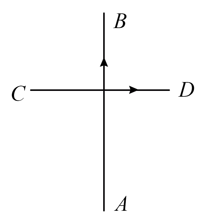如图所示,光滑水平面上垂直放置两条直导线,但相隔一小段距离,导线$AB$是固定的,另一条导线$CD$可绕交点处的转轴自由转动,当通入图示方向的电流时,下列说法正确的是$(\qquad)$