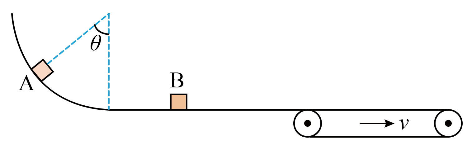 足够长的传送带固定在竖直平面内,半径$R=2\;\rm m$,圆心角$\theta=53^\circ $的圆弧轨道与平台平滑连接,平台与顺时针匀速转动的水平传送带平滑连接,工件$A$从圆弧顶点无初速度下滑,在平台与$B$发生弹性碰撞,已知$m_{A}=1\;\rm kg$,$m_{B}=4\;\rm kg$,$A$、$B$可视为质点,$A$、$B$与传送带间的动摩擦因数恒定,在传送带上运动的过程中,$B$物块因摩擦生热$Q=2\;\rm J$,忽略轨道及平台的摩擦,$g=10\;\rm m/s^{2}$,$\sin 53^\circ =0.8$,$\cos 53^\circ =0.6$。