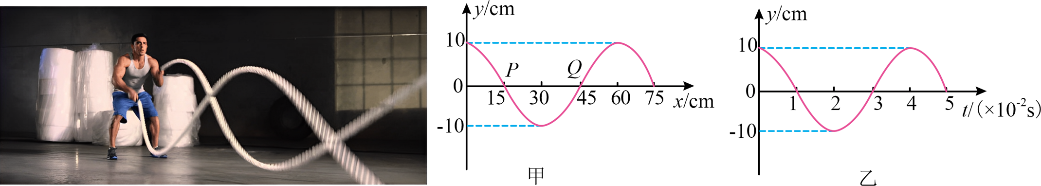“战绳”健身爱好者通过手握水平伸直绳的一端,抖动绳端在绳上形成机械波从而达到训练力量的目的。若将绳上形成的机械波视为简谐横波,如图所示,图甲为沿$x$轴传播的一列简谐波在$t=0.01\;\rm s$时刻的波动图像,$P$、$Q$分别是$x$轴上$x_{1}=15\;\rm cm$和$x_{2}=45\;\rm cm$处的两质点,其中图乙为质点$P$的振动图像,下列说法正确的是$(\qquad)$