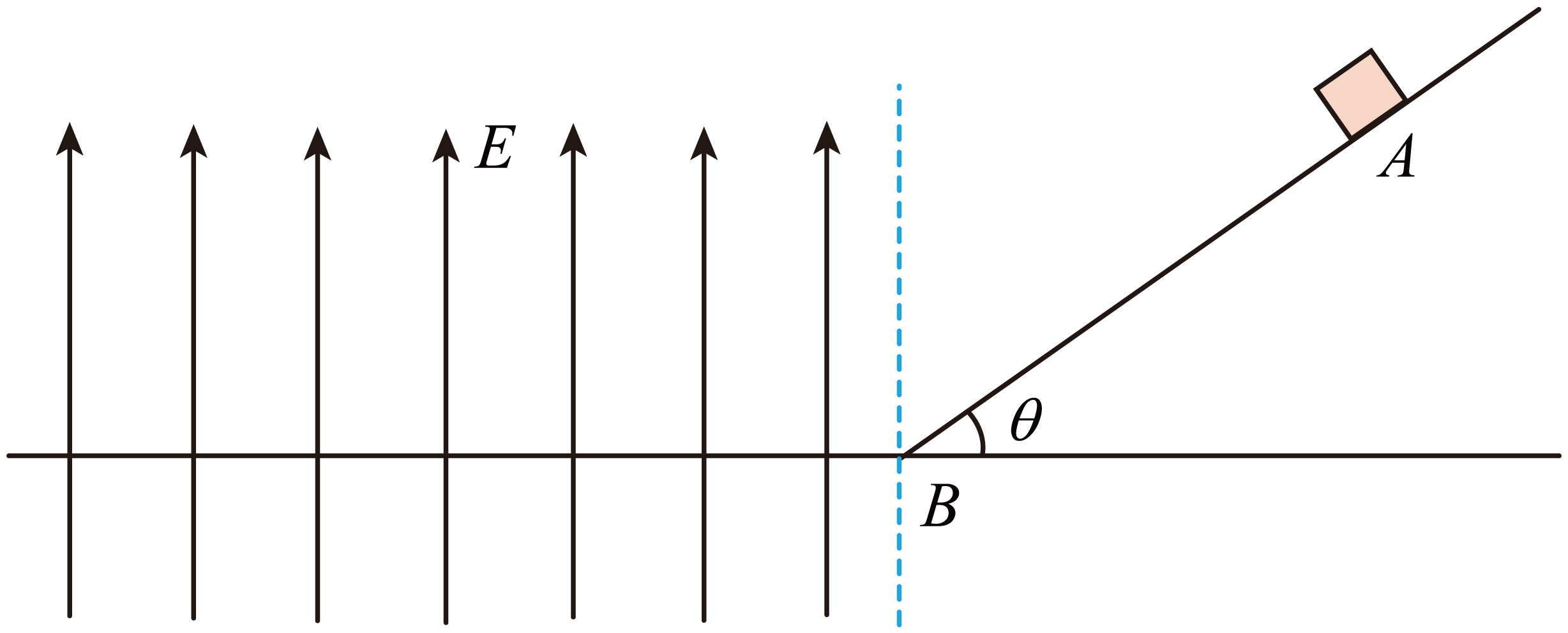 如图所示,斜面$AB$光滑,倾角为$\theta=30^\circ$,水平面粗糙,两个面在$B$点平滑连接。过$B$点的竖直虚线左侧区域有竖直向上的匀强电场$E$。一个质量$m=1\;\rm kg$,电量$q=-0.8\;\rm C$的物块(可视为质点)从$A$点由静止开始下滑,经过$0.9\;\rm s$刚好停在$C$点(图中未画出)。已知$AB$段的长度$x_{AB}=0.4\;\rm m$,物块与水平面间的动摩擦因数$\mu=0.2$,物块与所有接触面均绝缘,求: