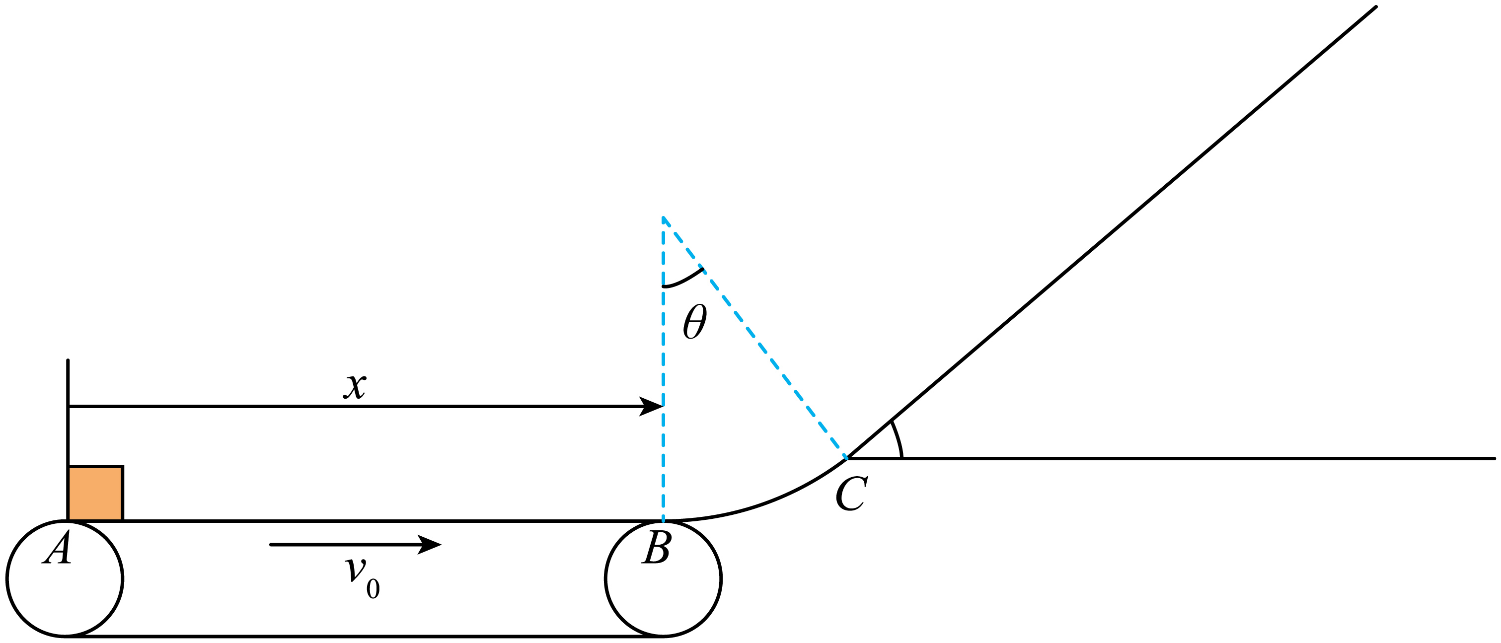 如图所示,水平放置的传送带与光滑的圆弧轨道相切于$B$点,圆弧与斜面相切于$C$点,斜面足够长。某时刻将一个质量为$1\;\rm kg$的物块(可视为质点)从$A$点轻放到传送带上。已知物块与传送带、斜面之间的动摩擦因数均为$0.25$,传送带的长度$x=5\;\rm m$,始终以$v_{0}=5\;\rm m/s$向右传动,圆弧$BC$对应的圆心角为$\theta=37^\circ $,半径$R=2.25\;\rm m$,求: