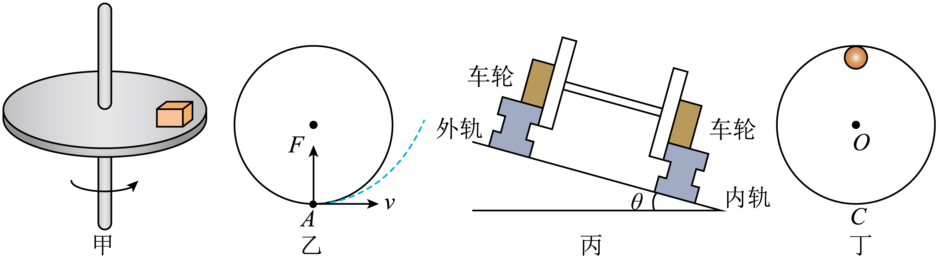","如图丁,小球在竖直平面内放置的圆形轨道内侧做圆周运动,过点$C$时小球对轨道的压力最小