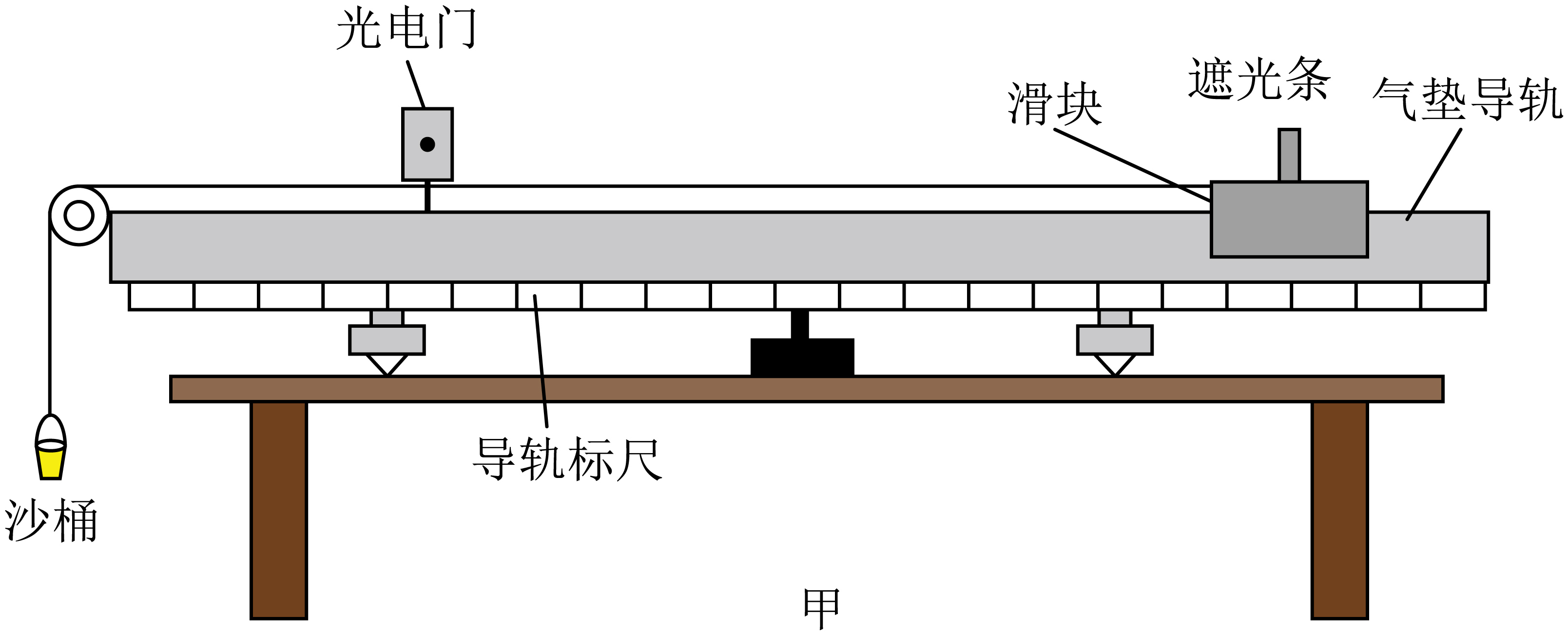 现有一套光电门的实验装置,如图甲所示,气垫导轨上安装光电门,滑块上固定一个竖直遮光条,滑块通过绕过定滑轮的细线与沙桶相连,沙桶离地足够高。调节气垫导轨水平,并使细线与导轨平行。测出滑块和遮光条的总质量$M$,沙桶质量为$m$,遮光条的宽度为$d$,遮光条到光电门的距离为$L$。