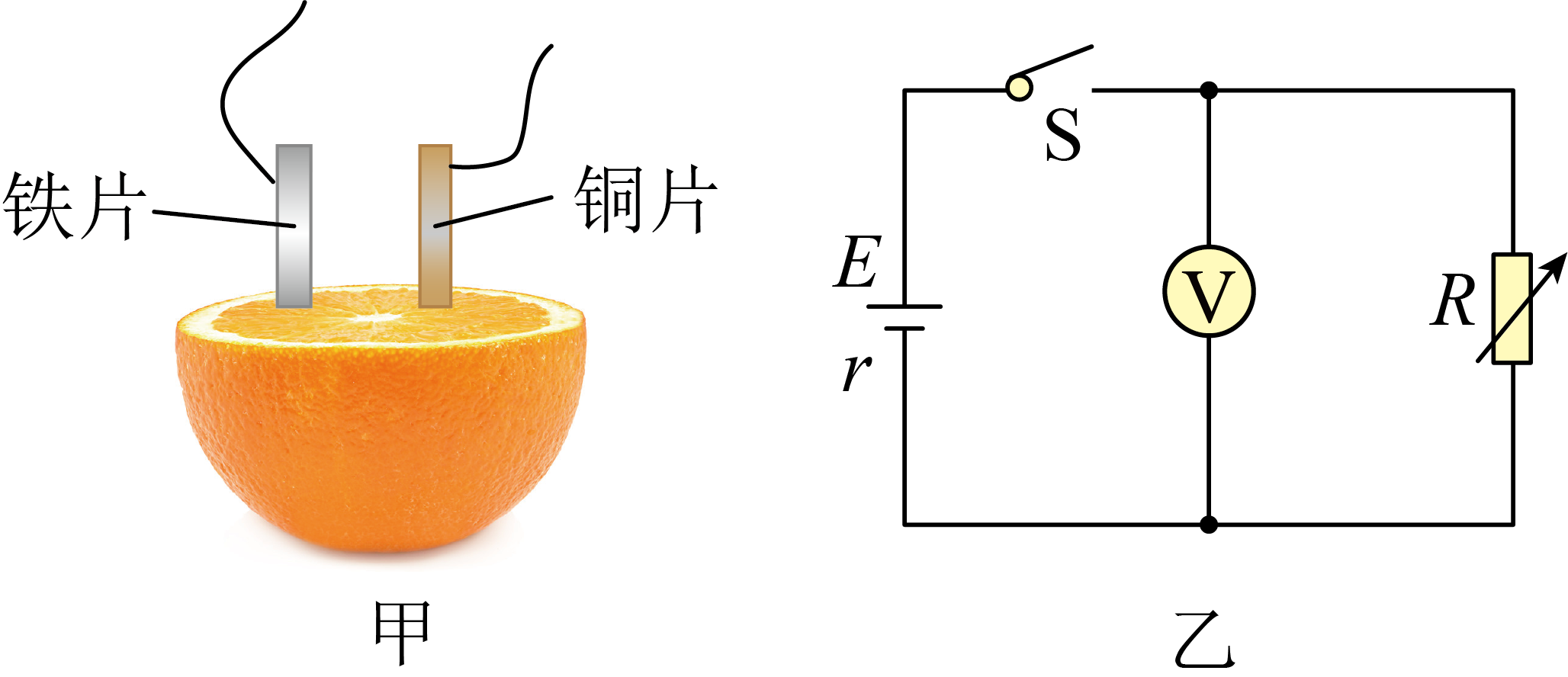 水果电池的内阻往往高达上千欧姆。如图甲所示,把铜片和铁片相隔约$1\;\rm cm$插入一个红美人中,就制成一个水果电池。把水果电池、电阻箱、电压表等按图乙连接起来,用电压表和电阻箱测出多组电压$U$和电阻$R$,就可以测量水果电池的电动势和内阻。