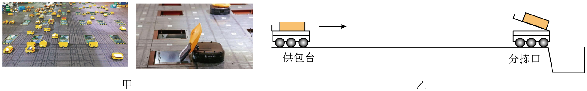 如图甲是物流用机器人运送、投递包裹的场景。简化图如乙所示,工作人员在供包台将包裹放在机器人的水平托盘上,包裹将自动送至方形分拣口,停止运动后缓慢翻起托盘,让包裹滑入投递口。其启动和制动过程可视为匀变速直线运动,抵达分拣口时,速度恰好减为零,翻转托盘倾角缓慢增大,直至包裹下滑,包裹与托盘接触面动摩擦因数为$\dfrac{\sqrt{3}}{3}$,最大静摩擦力近似等于滑动摩擦力,重力加速度$g$大小取$10\;\rm m/s^{2}$。现把质量$m=1\;\rm kg$的包裹从供包台沿直线运至相距$L=6\sqrt{3}\;\rm \text{m}$的分拣口处,在运行过程中包裹与水平托盘保持相对静止。运行最大速度$v=4\;\rm m/s$,机器人运送包裹途中,看作质点。求: