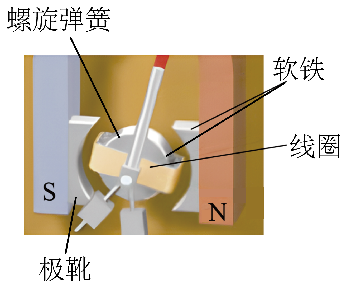 如图所示,为高中物理实验室常用的磁电式电流表的内部结构,其线圈绕在一个与指针、转轴相连的铝框骨架上,并处在极靴和铁质圆柱间的磁场中。某次测量时电流表指针向右转动,下列说法正确的是$(\qquad)$