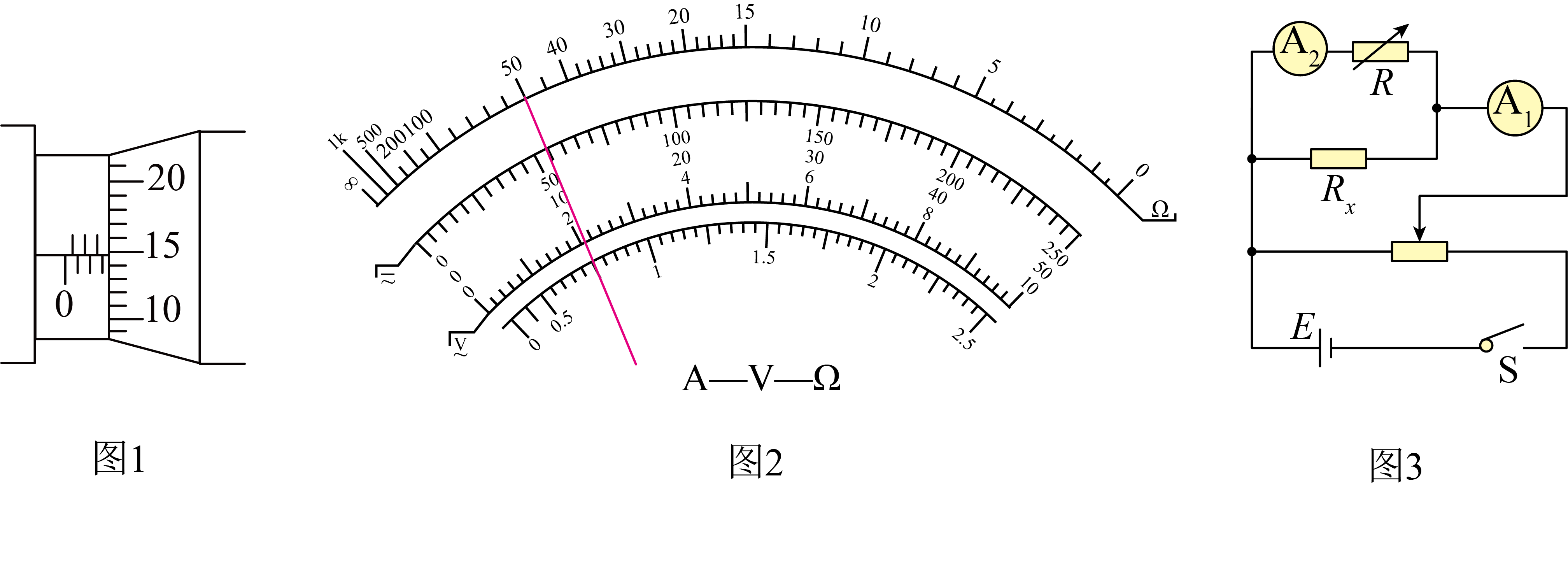 用多用电表粗测电阻丝的阻值,将多用电表选择开关置于“$\times 10$”挡,正确操作后发现多用电表指针偏转过大,因此需将开关旋转到欧姆挡 (填“$\times 1$”或“$\times 100$”)位置。再次进行测量,指针所指如图$2$所示,此测量值$R_{x}$为 $\;\rm \Omega$。