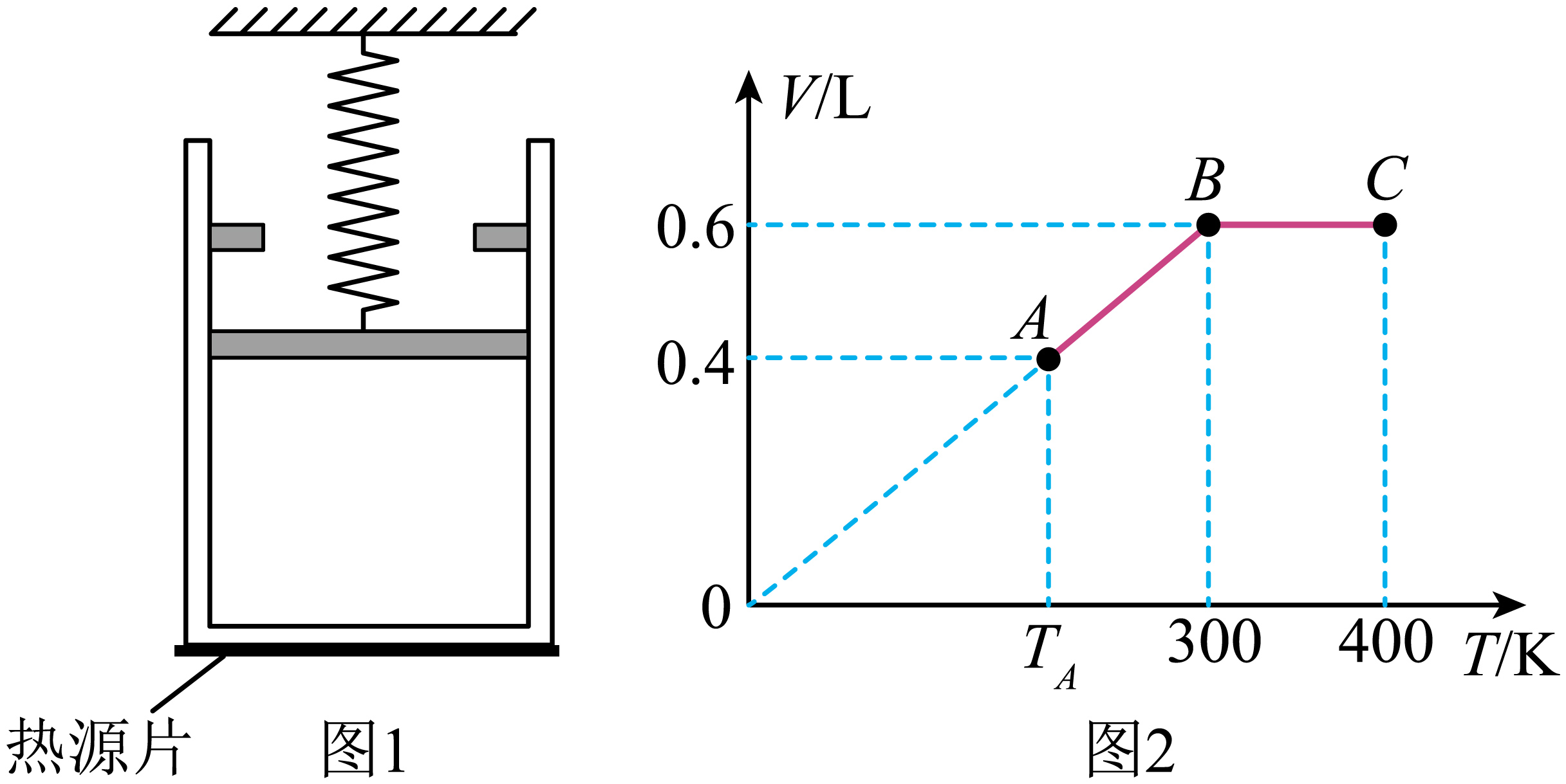 如图$1$所示,导热良好的圆筒内用面积$S=100\;\rm cm^{2}$质量不计的活塞封闭一定质量的理想气体,活塞上端与弹簧秤相连,能无摩擦滑动,整个装置竖直悬挂在空中,圆筒内气体处于状态$A$时,弹簧秤示数为$10\;\rm N$,升高热源片温度至状态$B$时,活塞被挡块挡住,继续升高温度至状态$C$,气体从状态$A$到状态$C$的$V-T$图像如图$2$所示,已知从状态$A$到状态$C$,气体内能增加$\Delta U=100\;\rm J$,大气压$p_{0}=1.01 \times 10^{5}\;\rm Pa$。