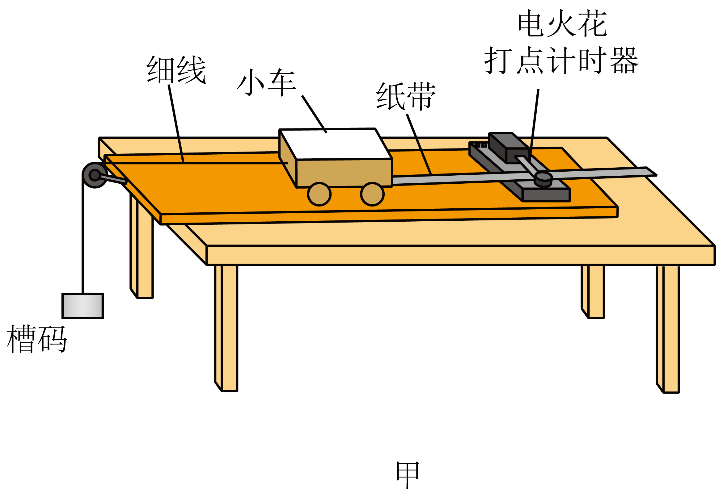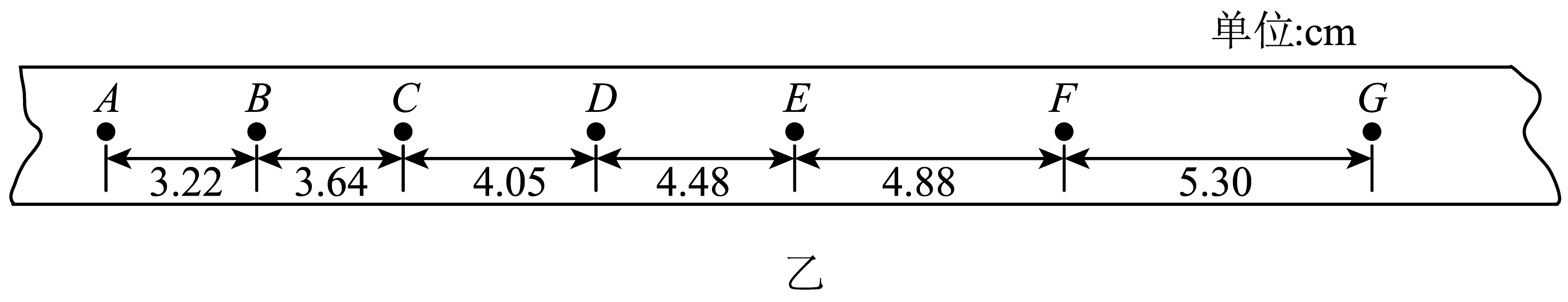 某次实验中打出的一条纸带如图乙所示,电源的频率$f=50\;\rm Hz$,其中每相邻两个计数点之间还有$4$个点没有画出,则由纸带可以求得小车的加速度大小为 $\;\rm m/s^{2}$(结果保留两位有效数字)。