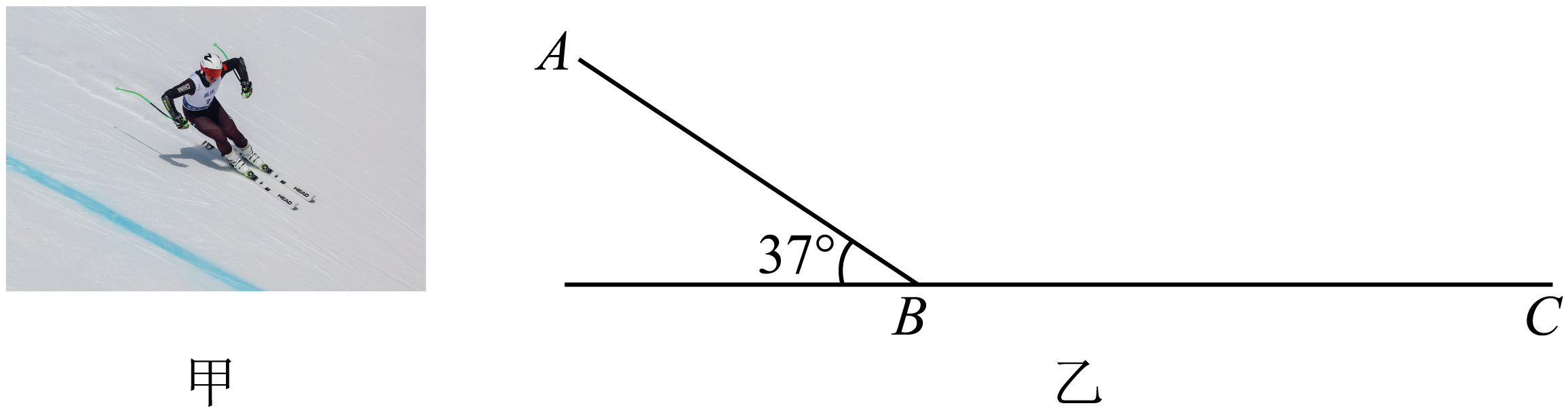 如图甲,滑雪是一项人们喜爱的运动。该运动可简化为如图乙所示的模型:倾角$\theta=37^\circ$的雪道与水平雪道在$B$点平滑连接,滑雪运动员及装备总质量为$75\;\rm kg$(视为质点),站在倾斜雪道上的$A$点由静止下滑,在$B$点进入水平雪道,最后在水平雪道滑行$80m$后停在$C$点。已知滑板与雪道间的动摩擦因数均为$\mu =0.25$, 取$g=10\;\rm m/s^{2}$,求: