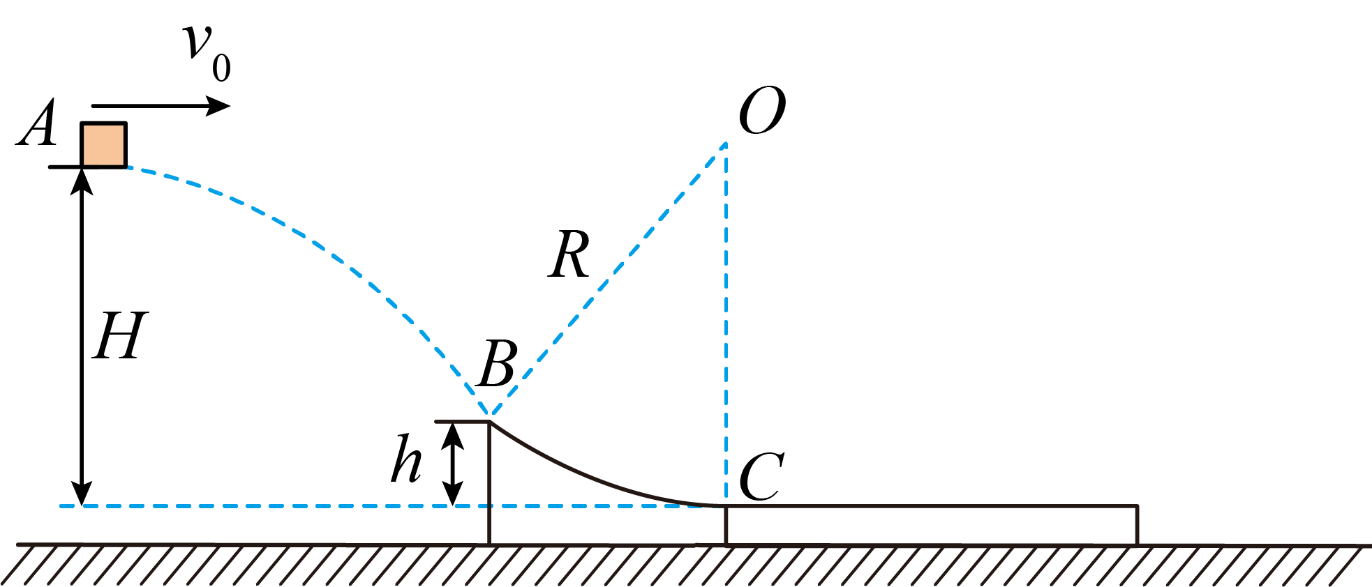 如图所示,从$A$点以某一水平速度$v_{0}$抛出质量$m=2\;\rm kg$的小物块(可视为质点),当物块运动至$B$点时,恰好沿切线方向进入圆心角$∠BOC=37^\circ $的粗糙固定圆弧轨道$BC$,经圆弧轨道克服摩擦力做功$W=19\;\rm J$后,滑上与$C$点等高、静止在光滑水平面上的长木板,圆弧轨道$C$端的切线水平。已知长木板的质量$M=1\;\rm kg$,$A$点距$C$点的高度$H=0.6\;\rm m$,圆弧轨道半径$R=0.75\;\rm m$,物块与长木板间的动摩擦因数$\mu =0.3$,$g=10\;\rm m/s^{2}$,$\sin 37^\circ =0.6$,$\cos 37^\circ=0.8$求: