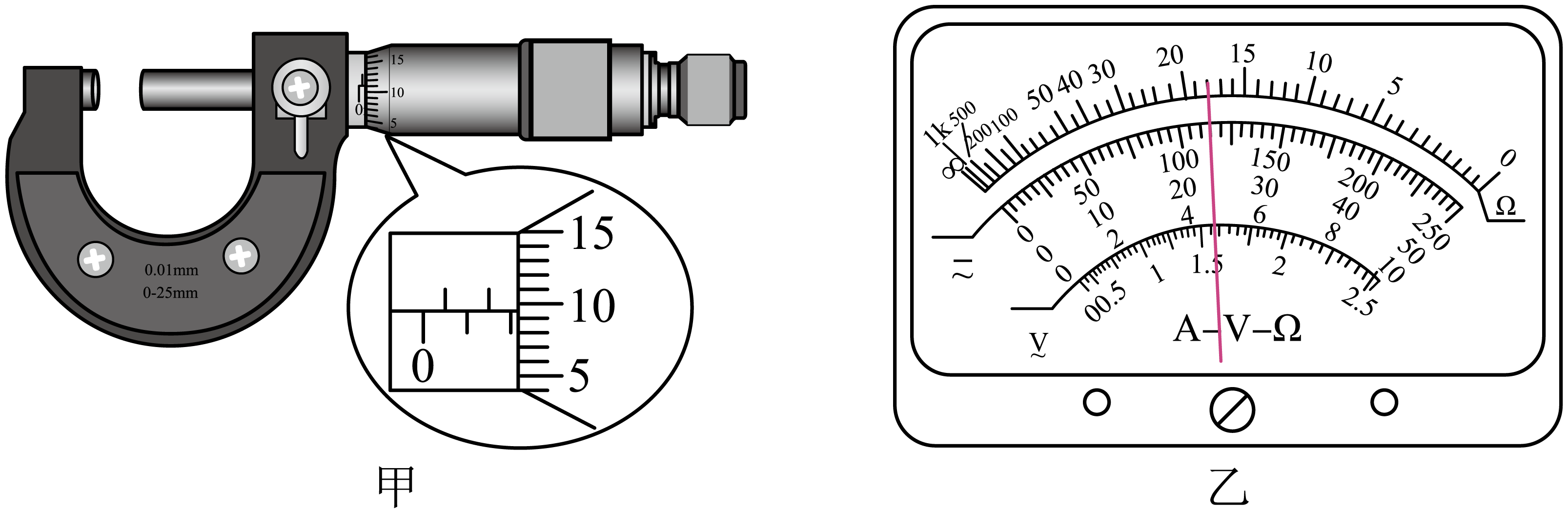 先用螺旋测微器测金属丝的直径,示数如图甲所示,则金属丝直径$d=$ $\;\rm mm$;再用多用电表的电阻“$\times 1$”挡,按正确的操作步骤粗测金属丝的电阻,表盘的示数如图乙所示,则该金属丝的阻值约为 $\;\rm \Omega$;