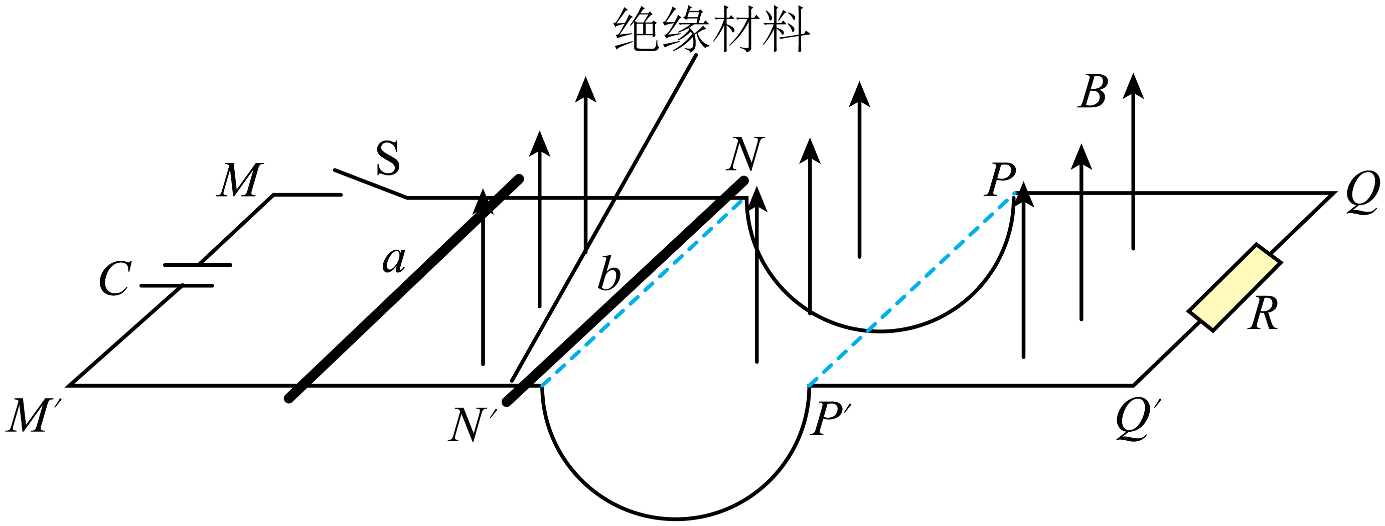 如图所示,间距$L=1\;\rm m$的导轨$MNPQ$、$M'N'P'Q$水平放置,$NP$、$N'P'$为半径$r=0.4\;\rm m$的半圆弧,其中$NN'$是一小段的绝缘材料,其余部分均导电,水平轨道和半圆弧轨道平滑连接。$MM'$处连接一充满电的电容器,电容$C=0.1\;\rm F$,$MN$、$M'N'$上垂直导轨放置两根质量均为$m=0.1\;\rm kg$的导体棒,$b$棒放在绝缘处,$a$棒在$b$棒左侧且相距足够远,$QQ'$连接有一$R=1\;\rm \Omega$的定值电阻。整个装置处于竖直向上磁感应强度$B=1\;\rm T$的匀强磁场中,接通开关$\rm S_{1}$,$a$棒被弹射出后与$b$棒发生弹性碰撞,碰后给$b$棒施加外力使其沿轨道匀速率运动,$b$棒运动至最低点时受到的支持力$F_{\rm N}=2\;\rm N$,运动到$PP'$时撤去外力后使其沿水平轨道自由滑行直至停止,运动过程中$a、b$棒始终与导轨垂直且接触良好。不计其他电阻,忽略一切阻力,取$g=10\;\rm m/s^{2}$、$\pi=3$,求: