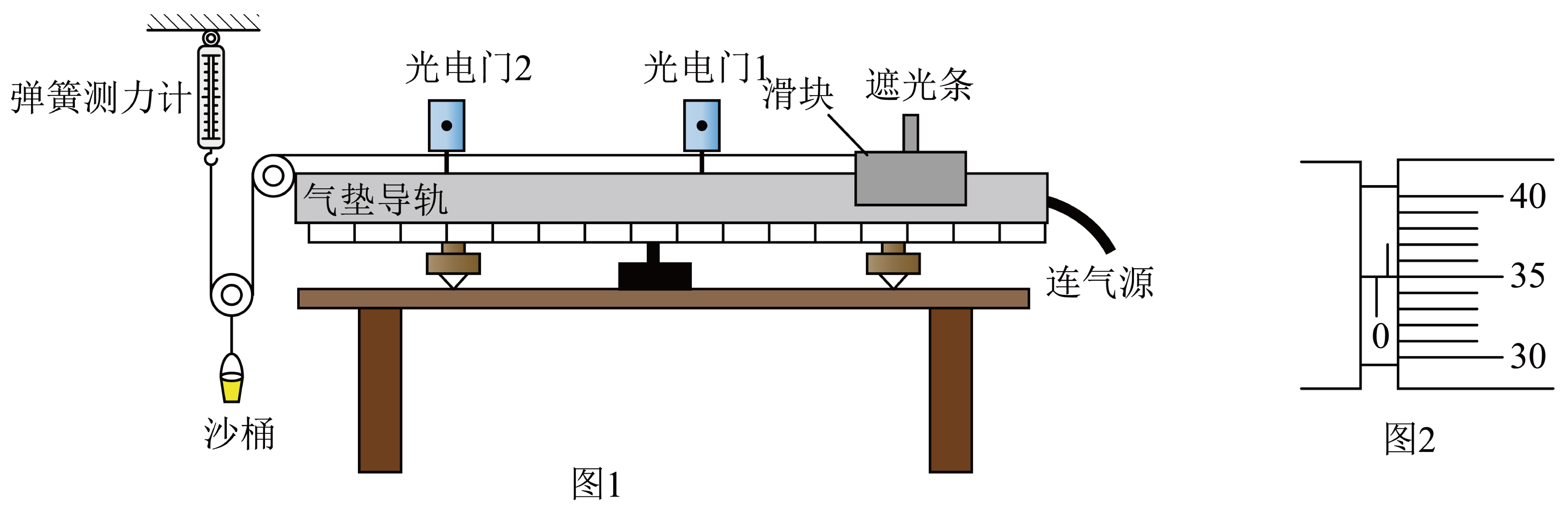 某同学用气垫导轨做探究加速度与合外力关系的实验。装置如图$1$所示,气垫导轨上相隔一定距离的两处装有光电门$1$、$2$,两光电门间的距离为$L$,滑块上固定一遮光条,遮光条和滑块的总质量为$M$,滑块通过光电门时,与光电门连接的数字计时器会记录遮光条的遮光时间。