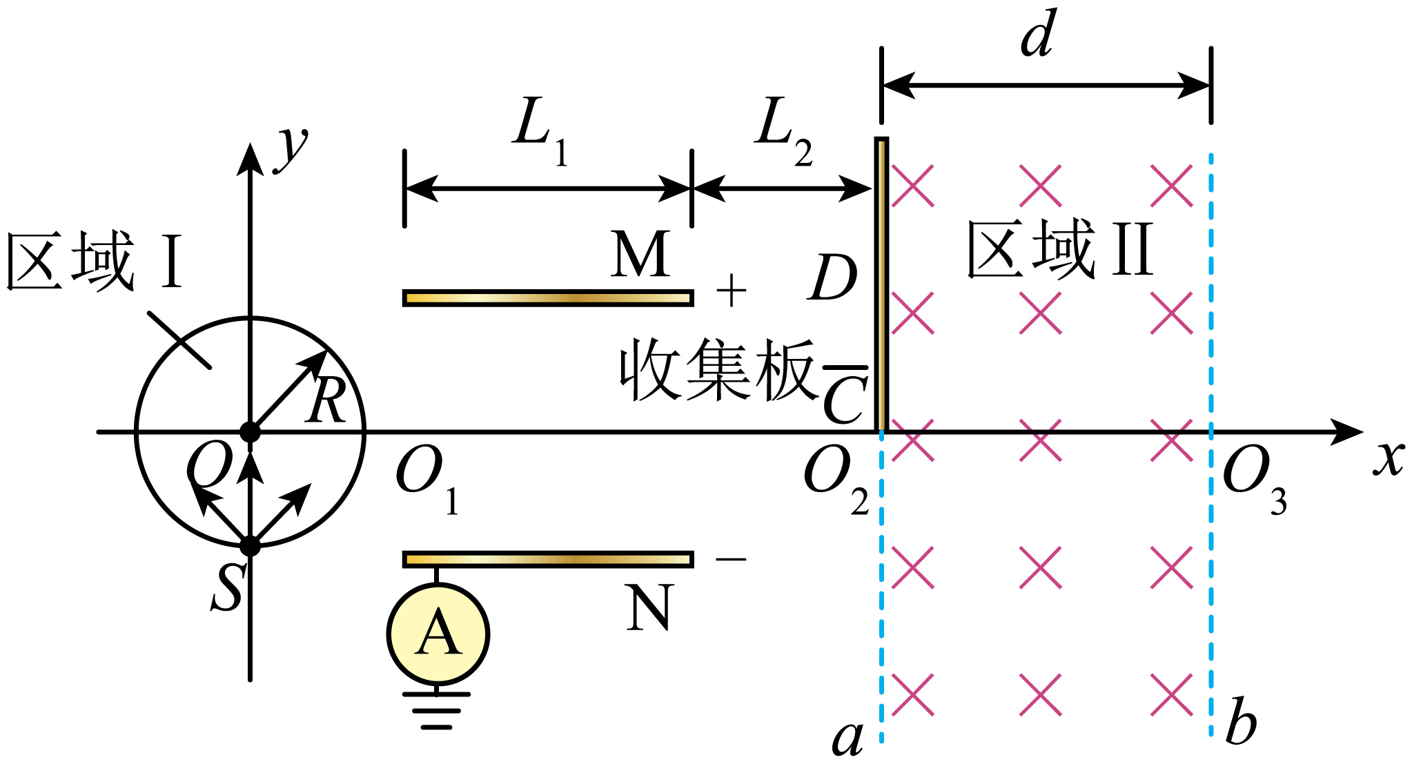 如图所示,在$xOy$平面内有一以$O$为圆心,半径为$R$的圆形磁场区域Ⅰ,磁感应强度为$B_{1}$(未知)。在圆形磁场区域右侧放置水平极板$M$、$N$,其中心线$O_{1}O_{2}$在$x$轴上,极板长度和极板间距离均为$L_{1}=2R$,极板间接有偏转电场的电压$U_{MN}$(未知)。位于$S$处的粒子源沿纸面内向圆形磁场区域内各个方向均匀发射速率为$v_{0}$的带电粒子,粒子质量为$m$、电荷量为$+q$,单位时间内放出的粒子数为$n$。所有粒子经圆形磁场偏转后均沿$x$轴正方向。其中沿$y$轴正方向入射的粒子从$O_{1}$点出磁场,并经过偏转电场后刚好从下极板的边缘飞出,打在下极板上的粒子立即被吸收,并通过电流表导入大地。距离极板$MN$右端$L_{2}=R$处有一宽度为$d=3R$的匀强磁场区域Ⅱ,磁感应强度为$B_{2}$,方向垂直纸面向里,$a$、$b$是磁场的左右边界。区域Ⅱ左边界上有一长度为$2R$的收集板$CD$,$C$端在$x$轴上。粒子打在收集板上立即被吸收。不计粒子的重力及粒子间的相互作用,不考虑电场的边缘效应。求: