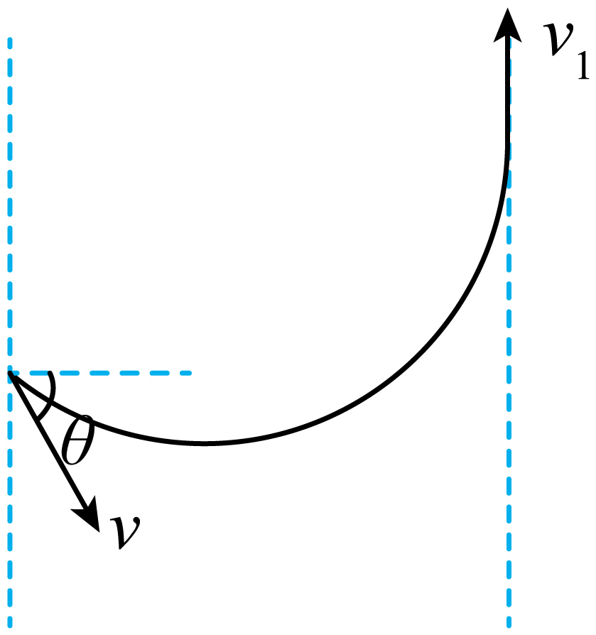 "]]当轨迹与磁场右边界相切时,设速度为$v_{1}$,如图所示