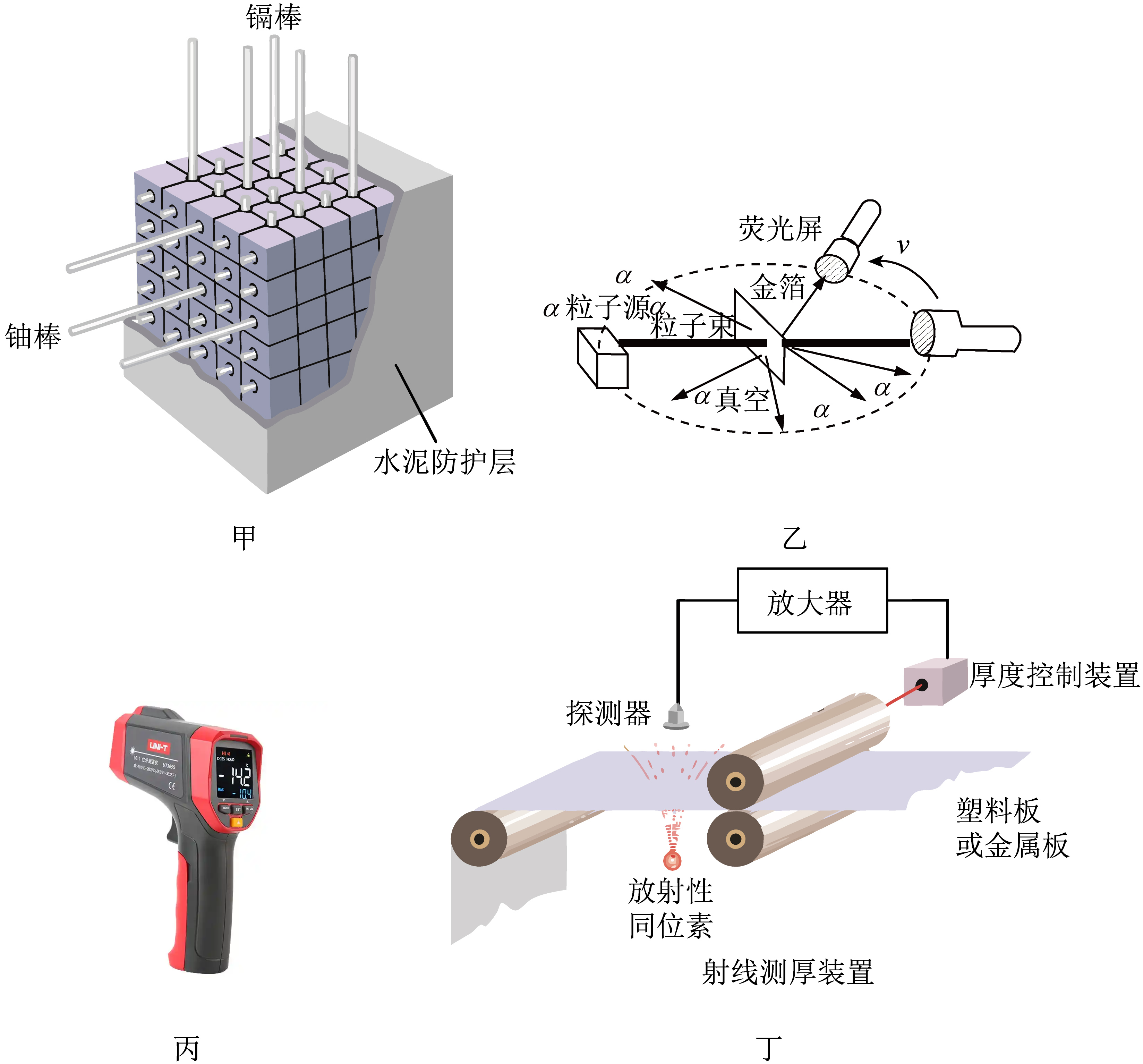 ","丁图中工业上利用放射性同位素产生的$\\alpha$射线来对钢板的厚度进行自动控制