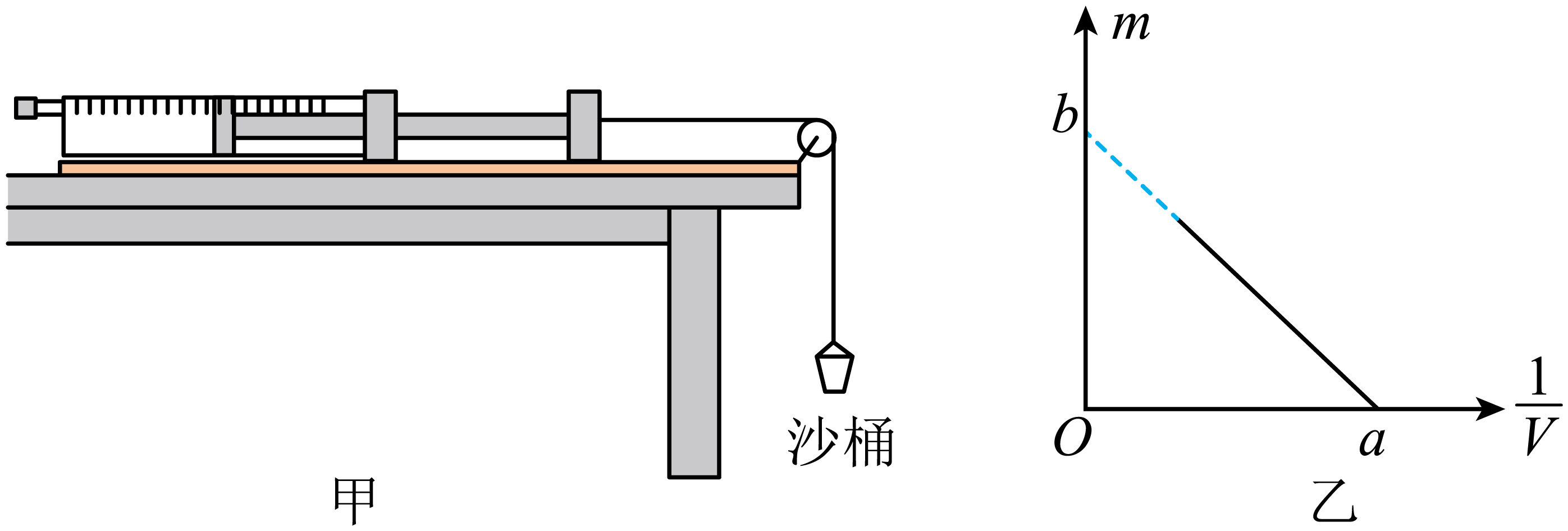 在沙桶内适量添加沙子,重复多次步骤,以沙桶的总质量$m$为纵轴,以$\dfrac{1}{V}$为横轴,绘制$m- \dfrac{1}{V}$图像,其图像如图乙所示,图中横轴截距为$a$,纵轴截距为$b$,可求得未悬挂沙桶时注射器内气体的体积$V_{0}=$ 。实验时当地的大气压强$p_{0}=$ 。(请选用$a$、$b$、$S$、$g$表示)