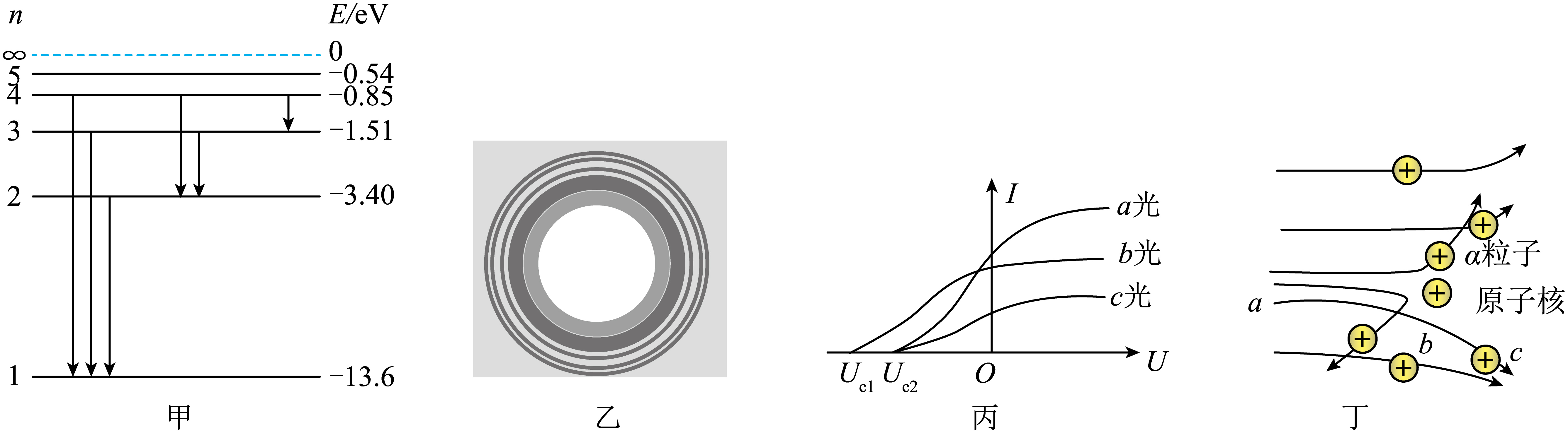 ","图丁是卢瑟福进行$\\alpha$粒子散射实验的图景,他通过实验分析数据后提出原子的核式结构模型