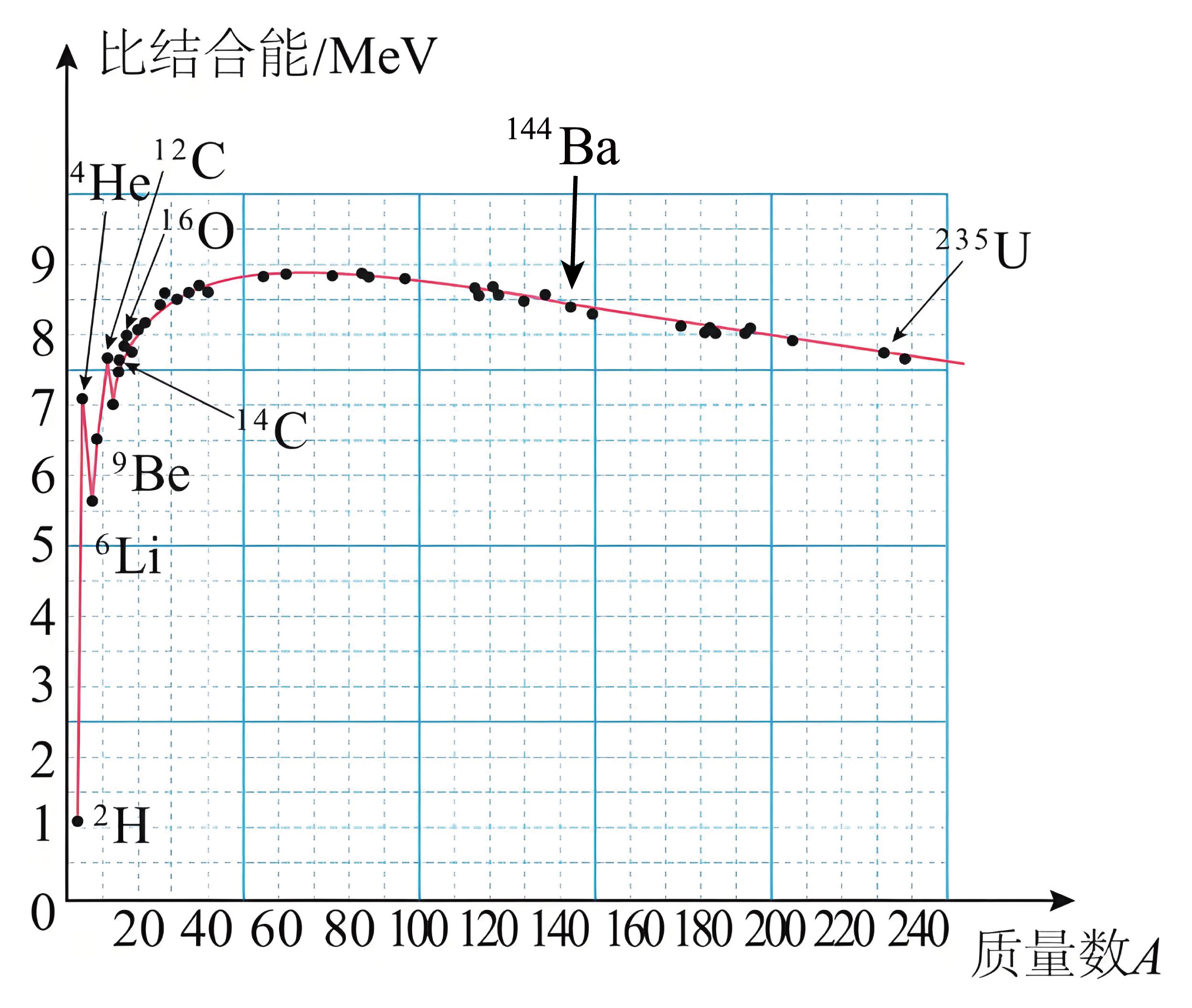 $\rm C$.比结合能是结合能与核子数的比值。由图可知$\rm _{8}^{16}O$核的比结合能比$\rm _{3}^{6}Li$核的比结合能大,$\rm _{8}^{16}O$核的核子数为$16$,$\rm _{3}^{6}Li$核的核子数为$6$。根据“结合能$=$比结合能$\times $核子数”,可判断$\rm _{8}^{16}O$核比结合能大,且核子数多,所以$\rm _{8}^{16}O$核的结合能比$\rm _{3}^{6}Li$核的结合能大,故$\rm C$错误。