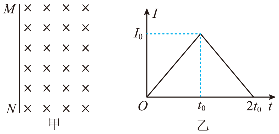 一个匀强磁场的边界是$MN$,$MN$左侧无磁场,右侧是范围足够大的匀强磁场区域,如图甲所示。现有一个金属线框沿$ab(ab⊥MN)$方向以恒定速度从$MN$左侧垂直进入匀强磁场区域,线框中的电流随时间变化的$I-t$图像如图乙所示,则线框可能是哪个$(\qquad)$