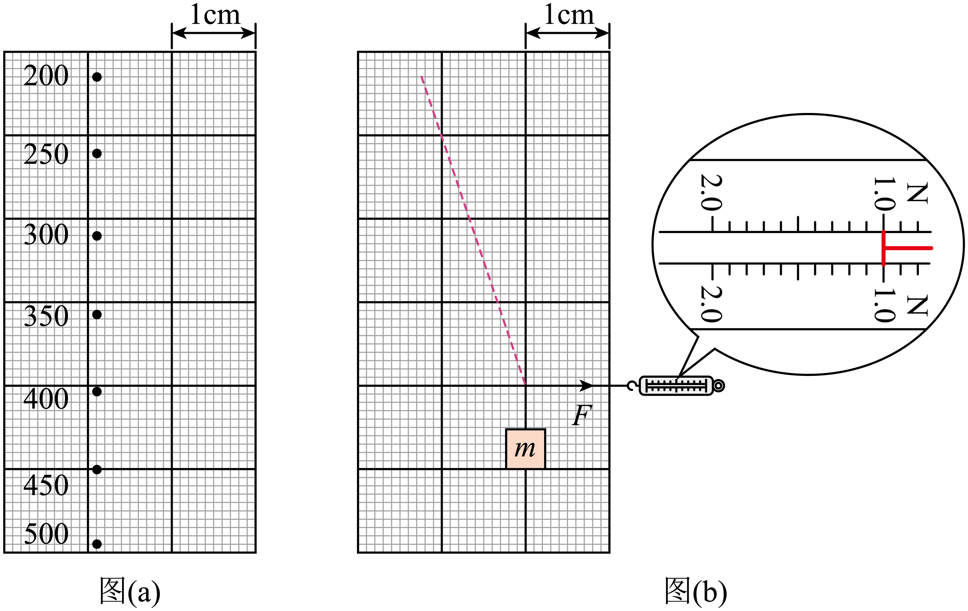 悬挂的钩码质量为$m$时,在橡皮筋底端施以水平向右的力$F$,平衡时橡皮筋方向如图($b$)中虚线所示,图($b$)中测力计的示数给出了力$F$的大小,则$F=$ $\;\rm N$,$m=$ $\;\rm g$(选填“$200$”“$300$”或“$400$”)。