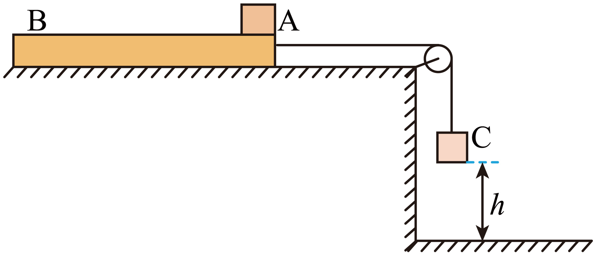 如图,物块$A$和$C$都视为质点,$A$放在长木板$B$右端,$C$通过轻绳绕过光滑定滑轮与$B$右端相连。已知$B$的质量为$m_{1}=3\;\rm kg$,与水平平台间的动摩擦因数为$\mu _{1}=0.2$;$A$的质量为$m_{2}=2\;\rm kg$,$A$与$B$间动摩擦因数$\mu _{2}=0.1$。托住$C$,刚好拉直轻绳且系统处于静止状态,$C$距地面高度为$h=1.5\;\rm m$,静止释放$C$。已知$B$右端离定滑轮足够远,在本题涉及的物理过程中不会与滑轮相碰,$C$若落地后不会反弹,长木板$B$足够长。认为最大静摩擦力等于滑动摩擦力,取$g=10\;\rm m/s^{2}$。
