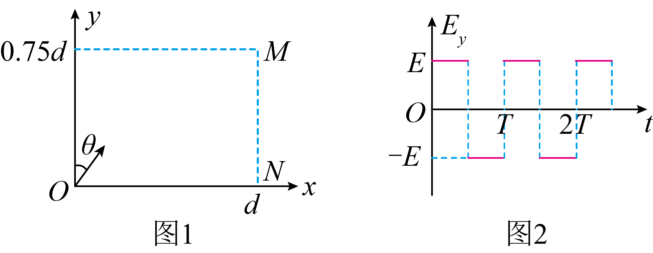 利用电场控制带电粒子运动有着重要的理论和应用价值。如题图$1$所示,$xOy$平面直角坐标系中,点$M$、$N$的坐标分别为$(d,0.75d)$、$(d,0)$,虚线与坐标轴围成的矩形区域内分布有周期为$T$($T$未知)且可调节的交变电场,电场强度大小为$E$、方向与$y$轴平行,其变化规律如题图$2$所示(一个周期$T$内正、负电场持续的时间相同)。$t=0$时刻,一质量为$m$、电荷量为$e$的电子,以初动能$E_{k}$从$O$点射入电场,入射角(与$+y$轴夹角)为$\theta$($\theta$未知),在$xOy$平面内运动,不计电子重力及电子间的相互作用,忽略电场方向突变的影响,$\sin37^\circ =0.6$。