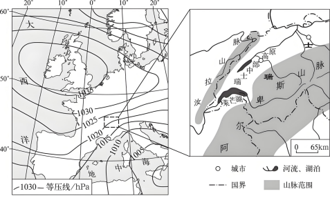 莱芒湖、又称日内瓦湖,位于法国与瑞士边境,是西欧面积最大的湖泊。下左图示意欧洲部分区域一种典型的海平面气压分布形势,冬季受该气压形势控制时,瑞士中部高原地区(下右图)风速较大,最大风速位于莱芒湖区。这种风会使瑞士中部高原地区出现逆温层,逆温层下方常有层云(低空中呈层状的云层)形成。据此,完成下面小题。