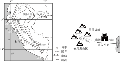 昌昌故城位于秘鲁北部,为古代美洲奇穆王国的首都,于850-1470年逐渐建成,它是世界最大的土坯城。源于安第斯山脉的地下水对昌昌故城具有重要意义,地下水通过地下引水到达故城外,后进入明渠,在故城上游一侧发展灌溉,在下游一侧用淡水和海水混合,发展鱼类养殖,包括淡水鱼和海鱼。近年来,全球气候变化和气候异常给昌昌故城土坯城遗址保护带来一定威胁。左图示意昌昌故城的位置,右图示意昌昌故城地下水利用方式。