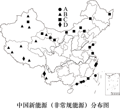 "]据图可知,A类能源主要分布在我国东部沿海地区,故A类能源为核能;B类能源主要分布在我国青藏高原、新疆等太阳能丰富的地区,故B类能源为太阳能;C类能源主要分布在我国新疆、甘肃及内蒙古等西北内陆(距冬季风源地近,风能丰富)及东部沿海地区(受夏季风影响大,海面摩擦力小,风力强劲), 故C类能源为风能;D类能源主要分布在我国青藏高原,且临近板块交界处,故D类能源为地热能。因此,ABCD代表的新能源依次是核能、太阳能、风能、地热能,D正确,ABC错误。故选D。