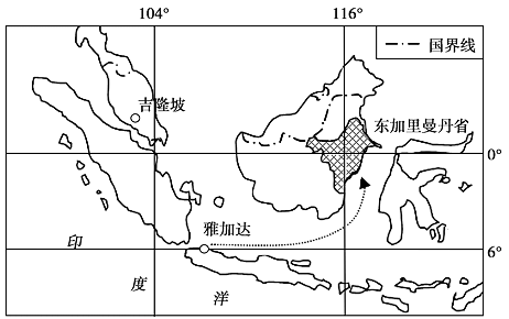 在过去的30年中,印尼首都雅加达下沉了近4米,近两年北部市区甚至以每年25厘米的速度迅速沉降。2022年1月18日,印尼国会批准了《国家首都法草案》,确定将首都从雅加达迁往东加里曼丹省。读图(箭头表示迁都方向)。据此完成下面小题。