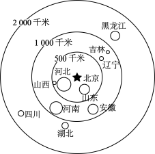 下图为某年北京市外来人口占比位列前十的省区分布示意图,圆圈越大,表示外来人口占比越大。据此完成下面小题。
