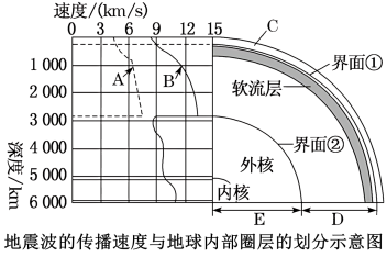 材料三:下图为地震波的传播速度与地球内部圈层的划分示意图