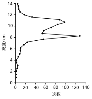 飞机短距是指飞机在飞行中遇到乱滚而突然出现的怒上怒下、左右接晃及机身振颤现象。图为多年表我国飞机颠簸发生高度平均统计图。据此完成下面小题。